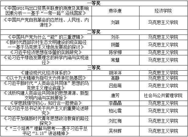 为深学笃用习近平新时代中国特色社会主义思想,引导全校青年积极投身到建设中国特色社会主义伟大实践中,由党委宣传部、学工部、校团委、马克思主义学院联合举办的“学习习近平新时代中国特色社会主义思想”主题征文活动共收到各类稿件80余篇,经评审专家严格审查打分,最终评选出论文类作品一等奖2名、二等奖4名、三等奖8名;心得体会类作品一等奖2名、二等奖4名、三等奖6名,现将获奖作者及文章题目公布如下: