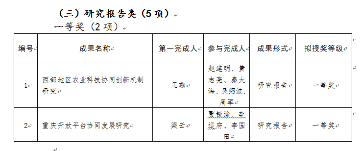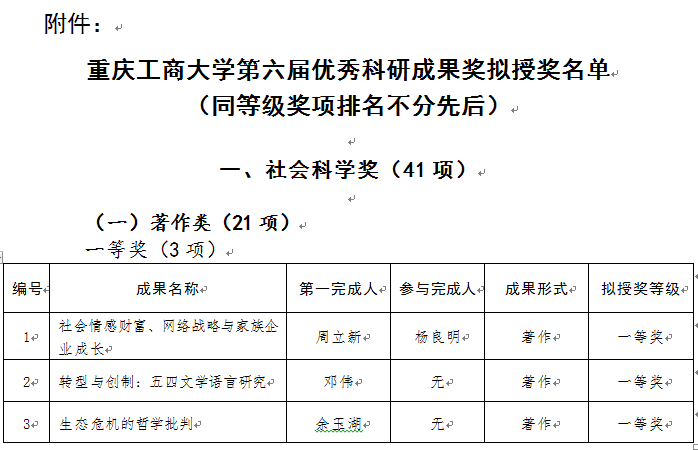 按照《pp电子游戏平台网站科学研究奖实施办法》和《关于组织申报pp电子游戏平台网站第六届优秀科研成果奖的通知》,参照国家科学技术奖、重庆市科学技术奖及重庆市社科优秀成果奖的评价指标体系,本着创新导向,质量优先,宁缺毋滥的原则,科研处组织校外专家成立若干学科评审组对申报成果进行评审。专家按照评分细则对申报成果进行了独立评审和投票表决。综合专家评审意见和授奖建议,形成了pp电子游戏平台网站第六届优秀科研成果拟授奖名单,拟授奖成果共计49项。现将《pp电子游戏平台网站第六届优秀科研成果奖拟授奖名单》予以公示。