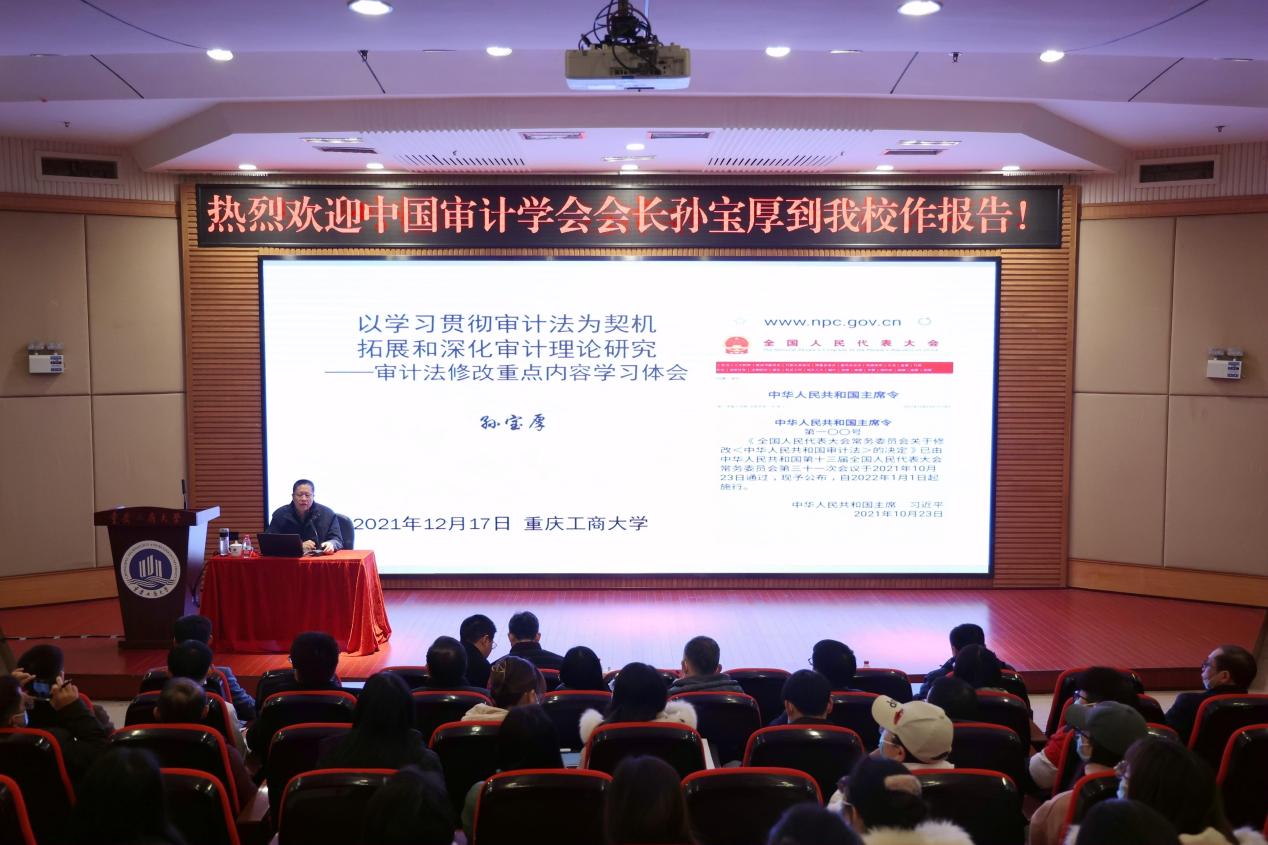 孙宝厚一行首先参观了pp电子图书馆、校史馆,并在博智楼7200学术报告厅为pp电子师生作学习、宣传、贯彻落实审计法的报告。校长孙芳城、副校长陈兴述,党政办公室主任、会计学院院长罗勇、财务处处长莫云、审计处处长王燕、会计学院副院长黄辉、钟廷勇及会计学院师生代表参加报告会。