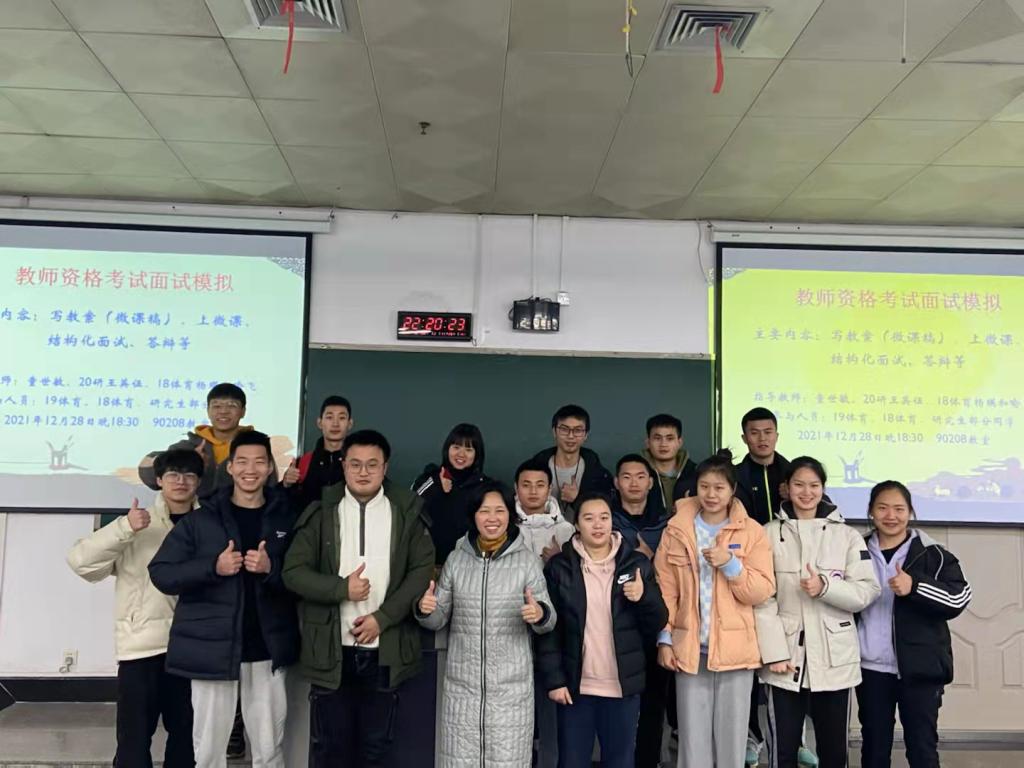 1月6日,获评2021年pp电子游戏平台网站师德先进个人的体育学院童世敏教授为即将参加教师资格面试学生进行模拟训练与专场指导,同时邀请了多位研究生、本科生做经验交流分享。