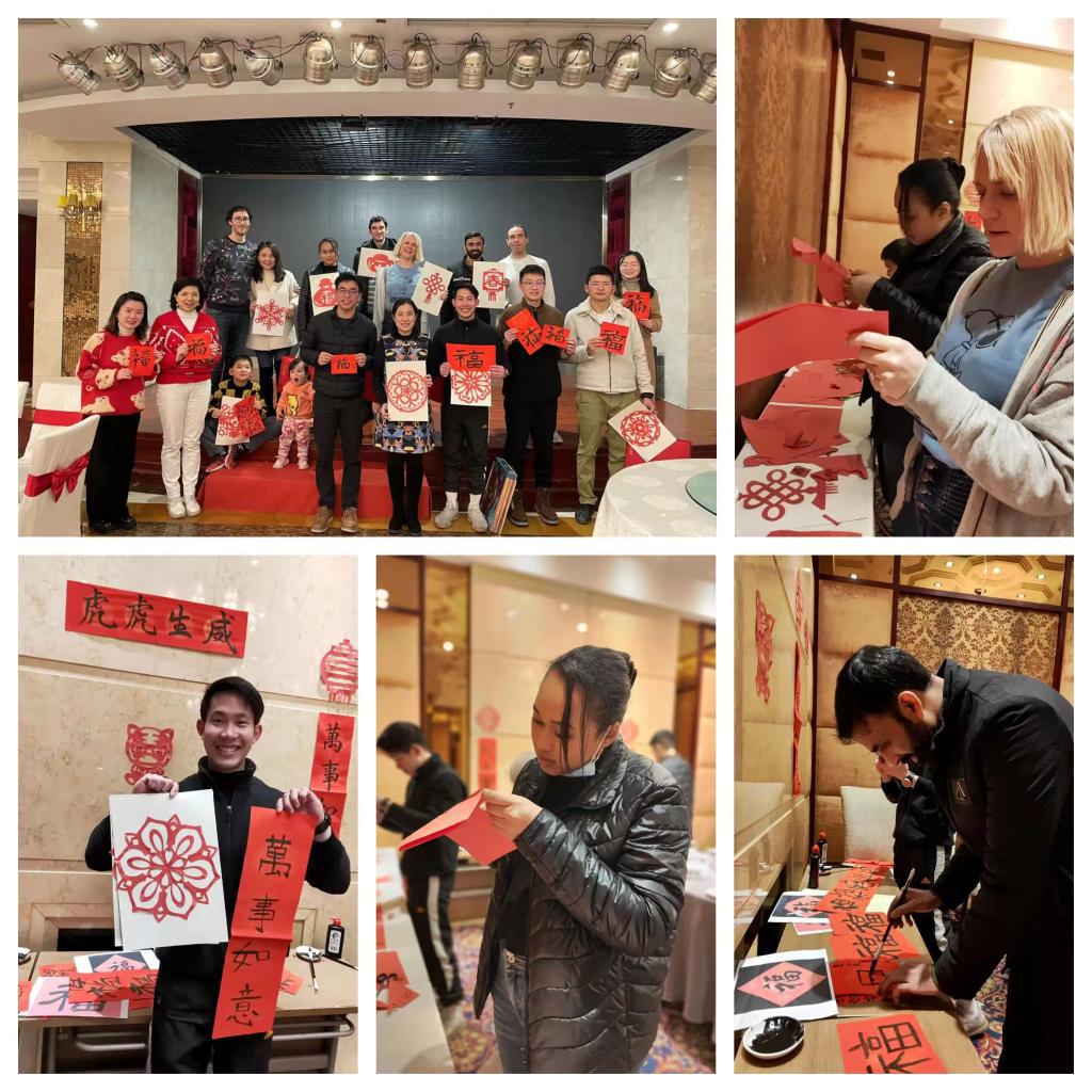 团拜会上,大家一起动手剪窗花,写对联,体验中国传统文化,欢声笑语间洋溢着喜庆的节日氛围。外籍师生纷纷表示,虽然自疫情发生以来无法回国与亲人团聚,但是学校的关怀让他们很感动,大家觉得很温暖,同时祝福学校在新的一年越来越好。