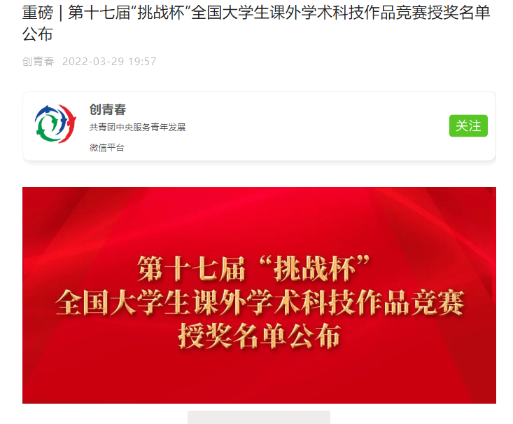 3月29日,第十七届“挑战杯”全国大学生课外学术科技作品竞赛授奖名单公布,pp电子游戏平台网站会计学院本科生匡琦芳、罗梦玮、喻冰倩、曹瑞、王浩鑫(指导老师:郝颖 蒋水全)组成的团队(参赛题目:生态文明战略下环保专项资金绩效审计体系构建及应用研究)荣获全国三等奖(重庆赛区特等奖)。