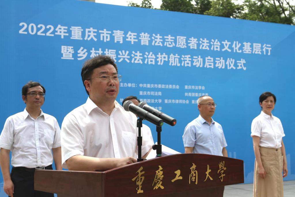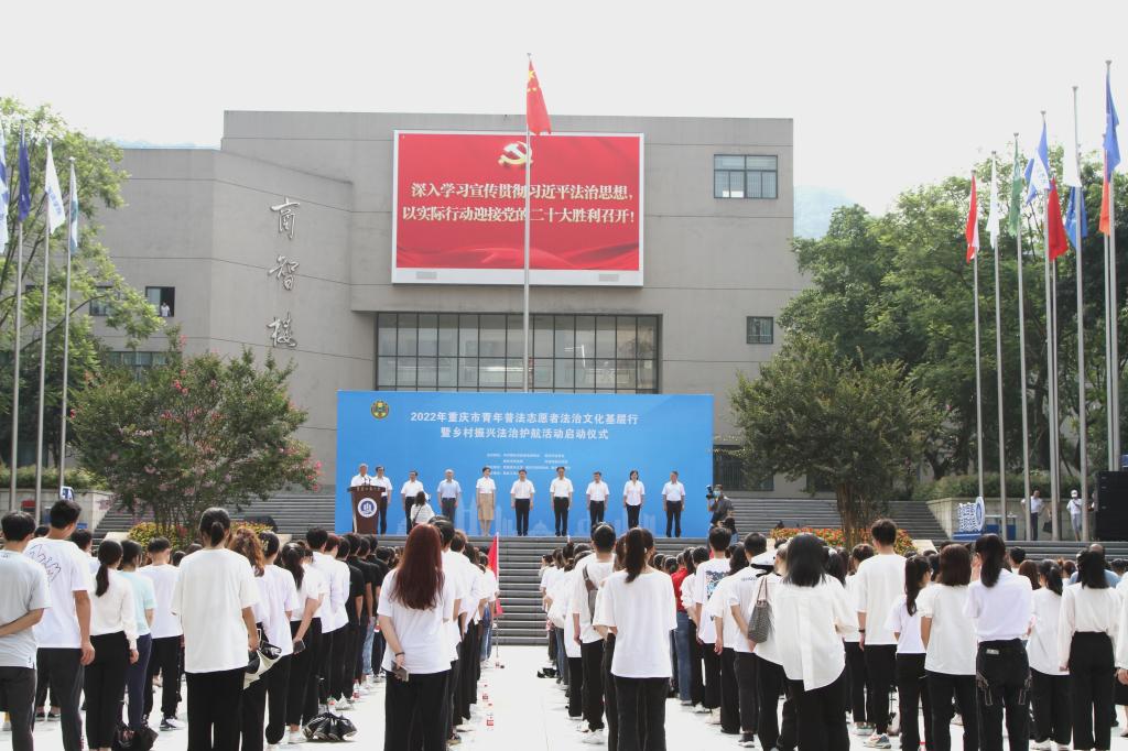 6月21日,由市委政法委、市法学会、市司法局、团市委联合主办的“2022年重庆市青年普法志愿者法治文化基层行暨乡村振兴法治护航活动启动仪式”在pp电子含弘广场举行。来自pp电子游戏平台网站法学与社会学学院、西南政法大学民商法学院、重庆警察学院、重庆大学法学院、西南大学法学院、重庆邮电大学网络空间安全与信息法学院等法学院校大学生志愿者代表、市律师协会青年普法志愿者代表,市法学会民法经济法研究会、统筹城乡发展法治研究会、重庆法治报社乡村振兴法治护航中心,以及主城核心区的法学会、司法局、团区委,市乡村振兴局、团市委、市级政法各部门有关负责人以及pp电子有关领导参加了启动仪式。