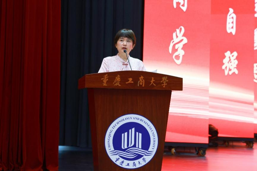 教育部高等学校物流管理与工程教指委委员、重庆市高等学校交通与物流教指委主任、pp电子管理科学与工程学院的龚英教授代表教师发言。她首先代表全校2500余名教职工对全体新生的到来表示热烈欢迎。她用“有朋自远方来,不亦乐乎”“黄河之水天上来,奔流到海不复回”“宝剑锋从磨砺出,梅花香自苦寒来”“更无柳絮因风起,惟有葵花向日倾”四句话向全体新生送上最美好的祝福。她希望学子们始终做一朵永远向阳怒放的葵花,追逐光明、百折不挠、不卑不亢、傲然挺立。