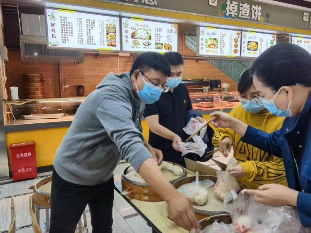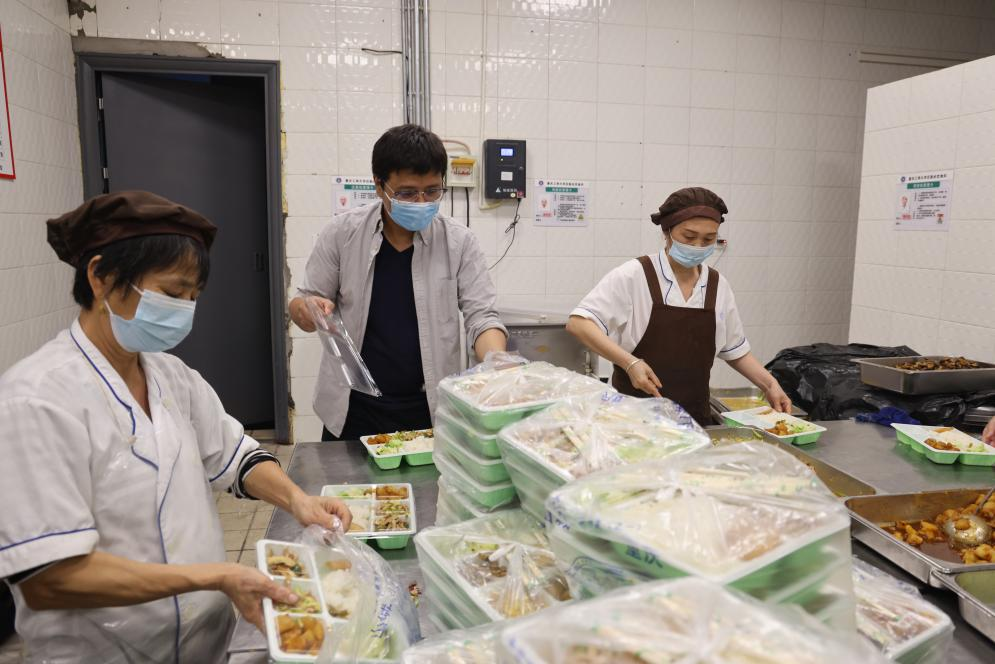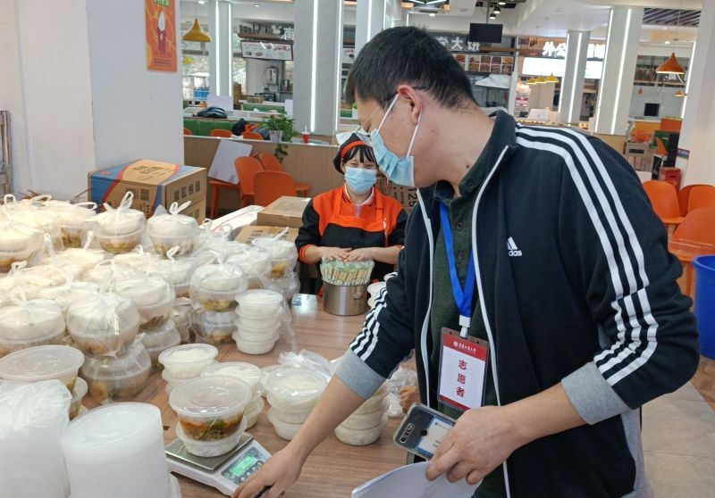 一部分志愿者们来到食堂,帮助食堂员工将做好的饭菜分装到饭盒里,再根据各个楼栋的人数分装到箱子里。“快点来哈,不要让同学们等久了,‘小飞车’早点把饭送过去,快归快,要注意安全哈。”同时,另外一部分志愿者正在挨个联系各楼栋的志愿者,通知他们准备好取餐。当分发完所有的餐食后,志愿者们才顾得上吃午饭,“没关系,只要同学们能准点吃上午饭就行,我们嘛,扛一扛就过去了。”