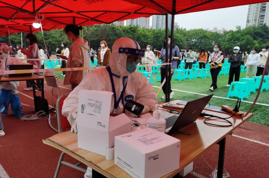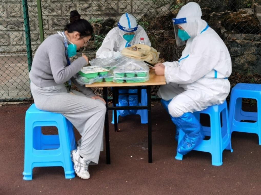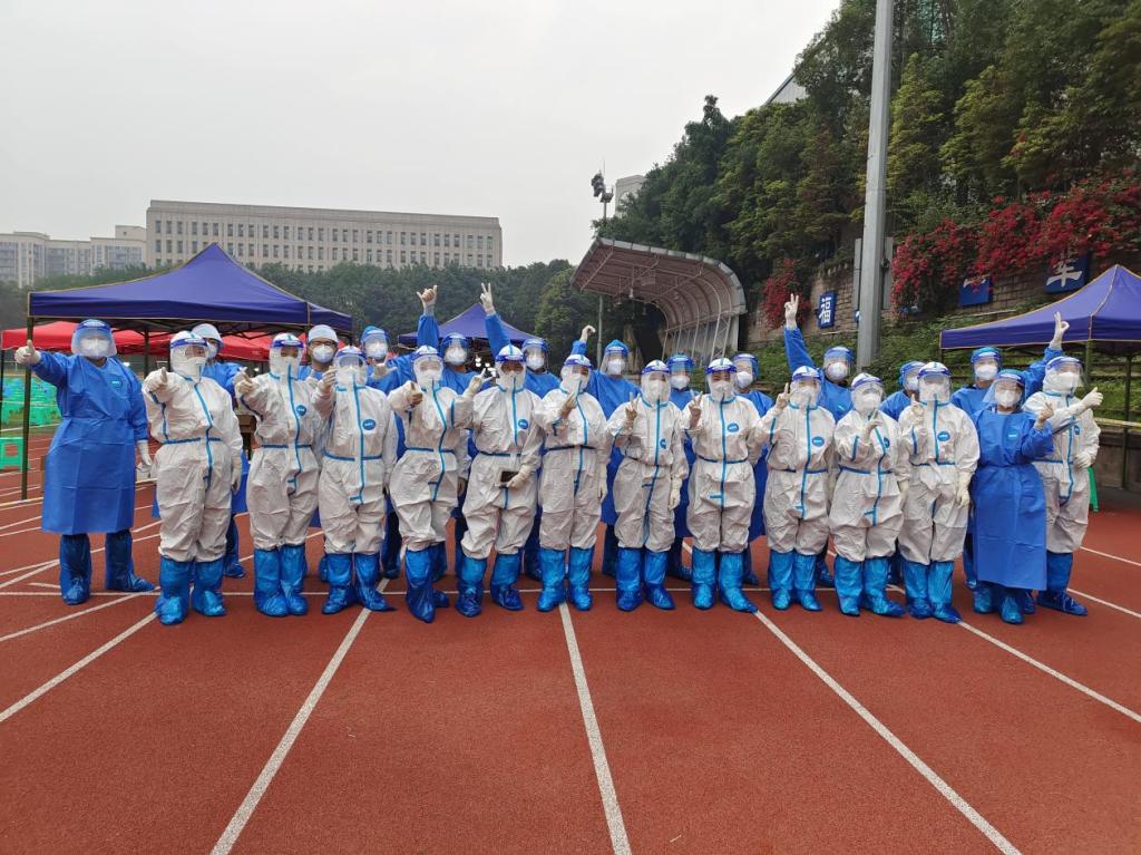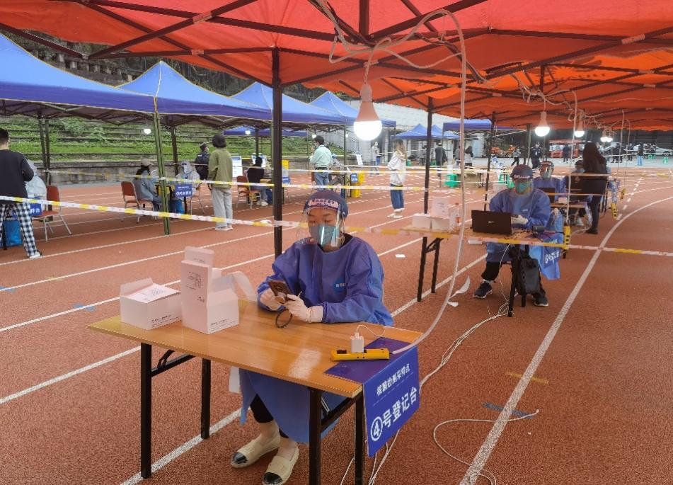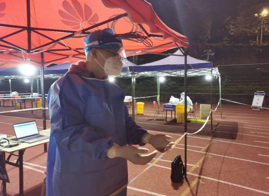 午后,志愿者们已经在操场就位,静静等待着前来做核酸检测的师生们。开箱、扫试管码、扫渝康码、核对姓名、确认信息、20人封管……虽枯燥但容不得半点错误,穿着防护服,一坐就是几个小时。“作为党员、作为志愿者,我做了自己想做和该做的事情。”“少喝水、少喝水,不喝水就不上厕所了呀,这个要忍一忍!”