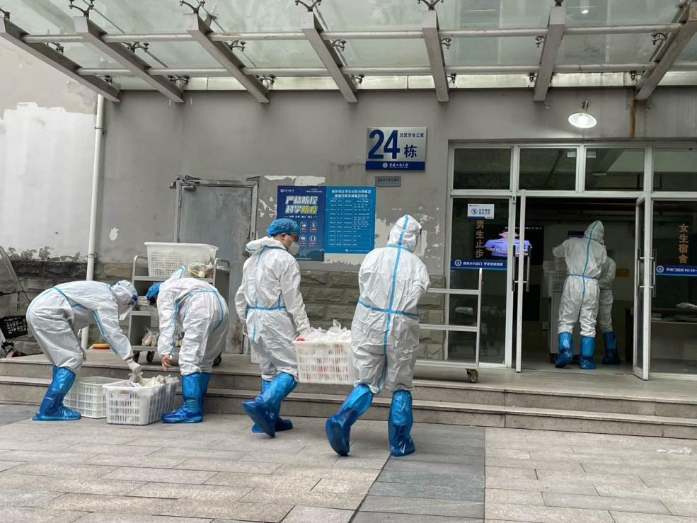 志愿者们到北区24号楼集合点,今天需要继续为封控楼栋的同学们送餐。穿上防护服,他们变身“大白”,将一箱一箱准备好的早餐搬下车,抬上梯坎,搬到宿舍前,开始挨个寝室发放。取餐是这栋楼的同学们跟外界交流的唯一时间。但志愿者们每次都会朝着学生们挥挥手,点点头,再比个心,让同学们感到很温暖。