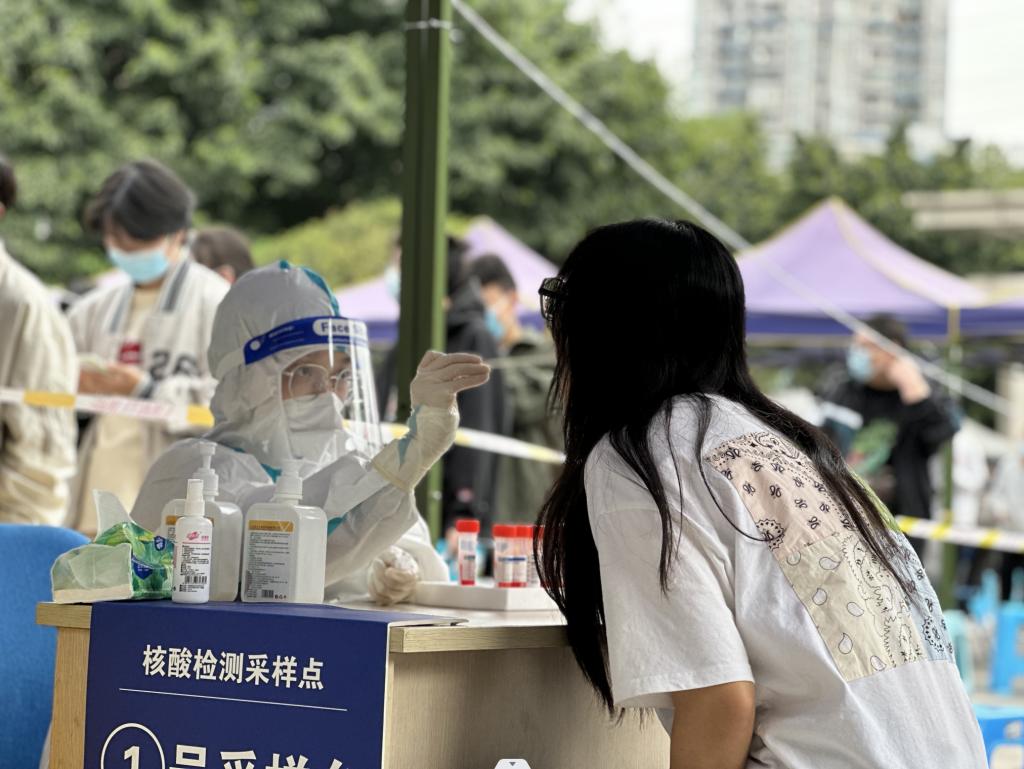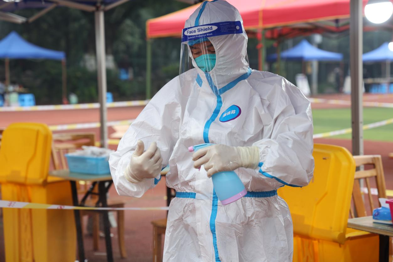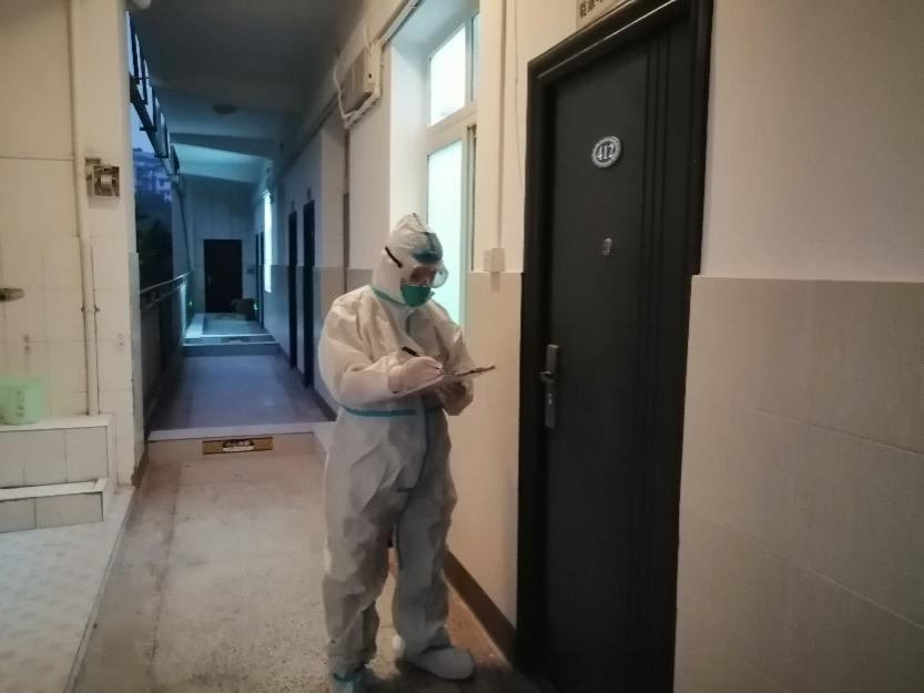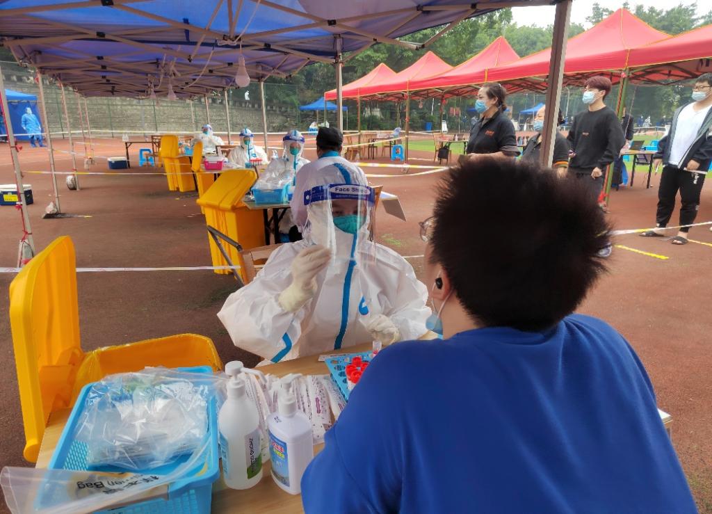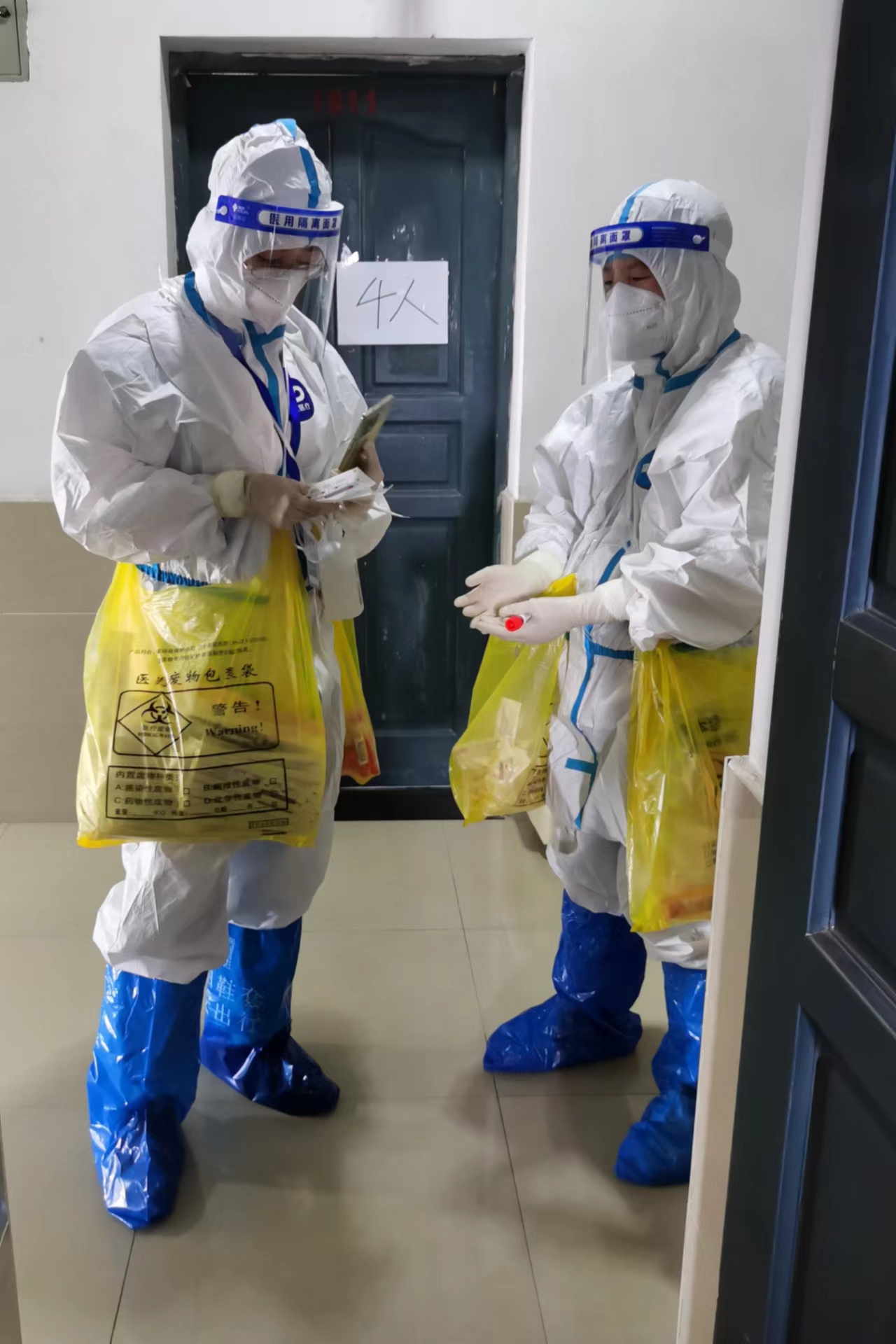 医务人员们奔赴各自的岗位,开始一天的工作。他们被分到不同的区域,有的深入学生公寓,上门为学生做核酸检测;有地赶往家属区,为行动不便的教职工上门采样;有的则在集中核酸检测点,等待着师生员工的到来。上门做核酸检测的医务人员,腰上都要绑一个黄色的塑料袋,便于放置采集的样本。为了不漏一人,他们跑上跑下,一层一层地敲门,腰间的袋子早已经变得沉甸甸了。“再闷再累也要把这一栋楼核酸检测完,才能让大家放心。”