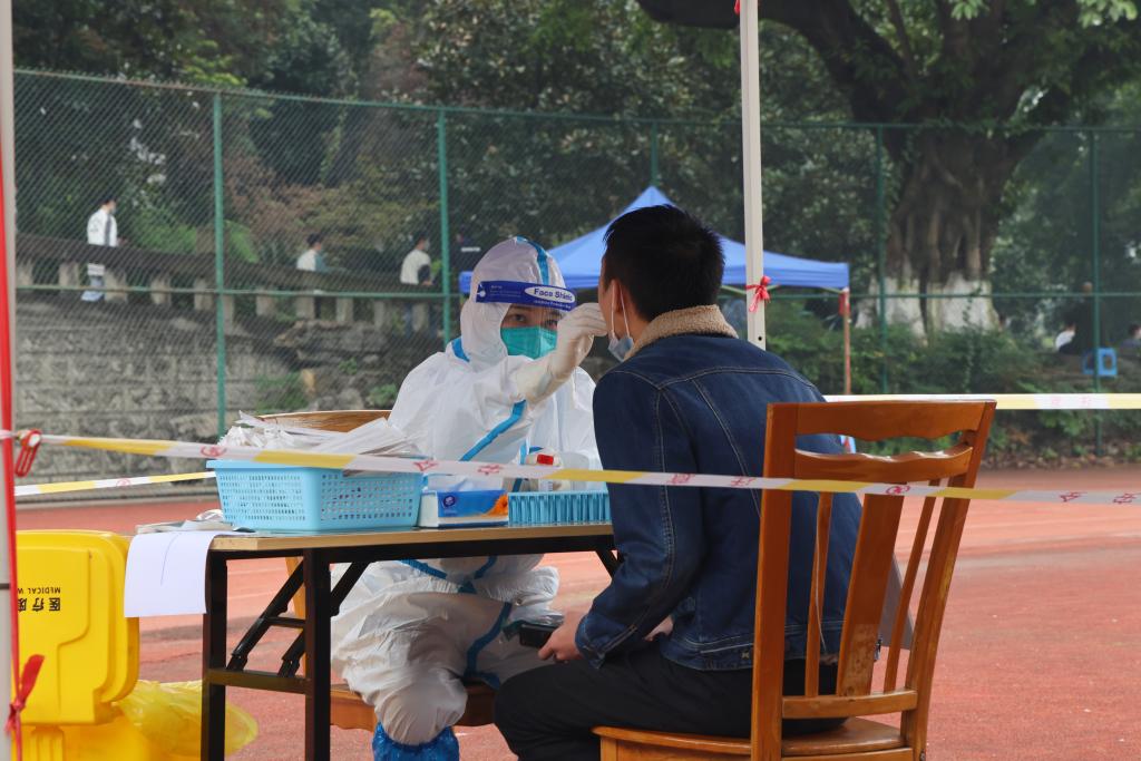 一天中最忙碌的时刻到来了。陆续下网课的学生们从宿舍纷纷赶来,依次排队等待着进行核酸检测。每天穿上防护服,连续几个小时的工作,他们不吃不喝不去厕所。每采一个标本,就要抬起一次手臂、进行一次消毒,呼吸产生的水雾让防护面罩变得模糊起来,不断重复的采样动作也让很多医务人员感觉颈椎异常疲劳。因为穿着防护服,虽然早晚已有些凉意,医务人员们的汗水还是止不住地顺着脸颊往下淌。望着排队等待核酸采样的同学们,他们只想着自己手上的动作快点、再快点。“加把劲,坚持住!”他们互相鼓励。