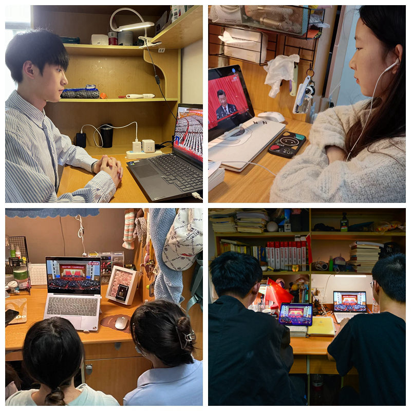 虽然受到疫情影响,但广大师生热情不减,纷纷在办公室、在寝室、在家中积极收听收看开幕会盛况。学校北区24栋临时党支部组织换岗休息志愿者集中收看了大会开幕会。