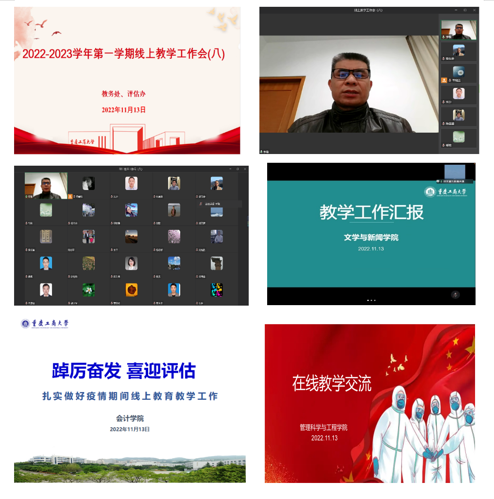 会上,教务处、评估办对近期工作进行了工作提醒和布置。评估办陈翀老师从收集到的学生反映情况、年底固定工作考核等方面做了汇报和提醒,教务处副处长韦晓兰就近期教学工作做了安排:一是对下周线上教学运进行了安排,二是强调线上教学要关注教师、关爱学生,形成有热度、有深度、有温度的课程思政内容;三是通识选修课要提醒老师进行专业限制的设置,避免学生误选影响修课和学分认定;四是学院和教务处多沟通,全面落实好下学期教学计划。教务处副处长胡卫军从实验课运行、毕业论文选题、市级优秀本科毕业论文推荐等方面的工作做了通报。教务处副处长黄潇从在线考试、在线开放课程项目验收、基层教学组织优秀案例推荐等方面做了安排。教务处处长骆东奇就各种考试安排、实验课教学组织优化、线上授课平台使用、学生学习效果关注等做了强调,并就落实本次会议安排做了要求,各学院及时召开全院教师大会,分享兄弟学院线上教学好的经验,会后及时召开会议,落实、告知、提醒老师做到课堂意识形态安全、疫情防控等方面要求,继续思考如何调动学生学习兴趣、全面了解学生学习情况的好的方法。