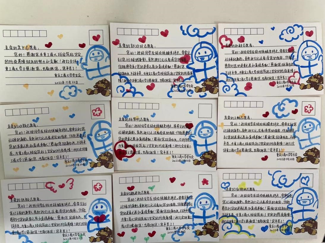 据悉,近期为pp电子师生进行核酸采样的志愿者当中,有13名来自重庆医科大学,他们每天需要一个姿势保持5小时,一套动作重复千百遍,已连续多日为pp电子师生开展核酸采样服务。为表达对兄弟高校志愿者的感激之情,pp电子学生会的同学们看望慰问志愿者并送上手工制作的感谢卡片,向这群“最美逆行者”致敬。同学们热情邀请志愿者们在疫情消散之后重回重工商大校园做客,与pp电子同学进一步交流。