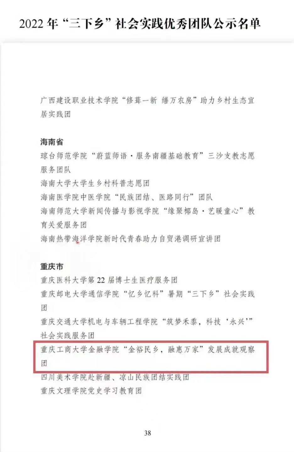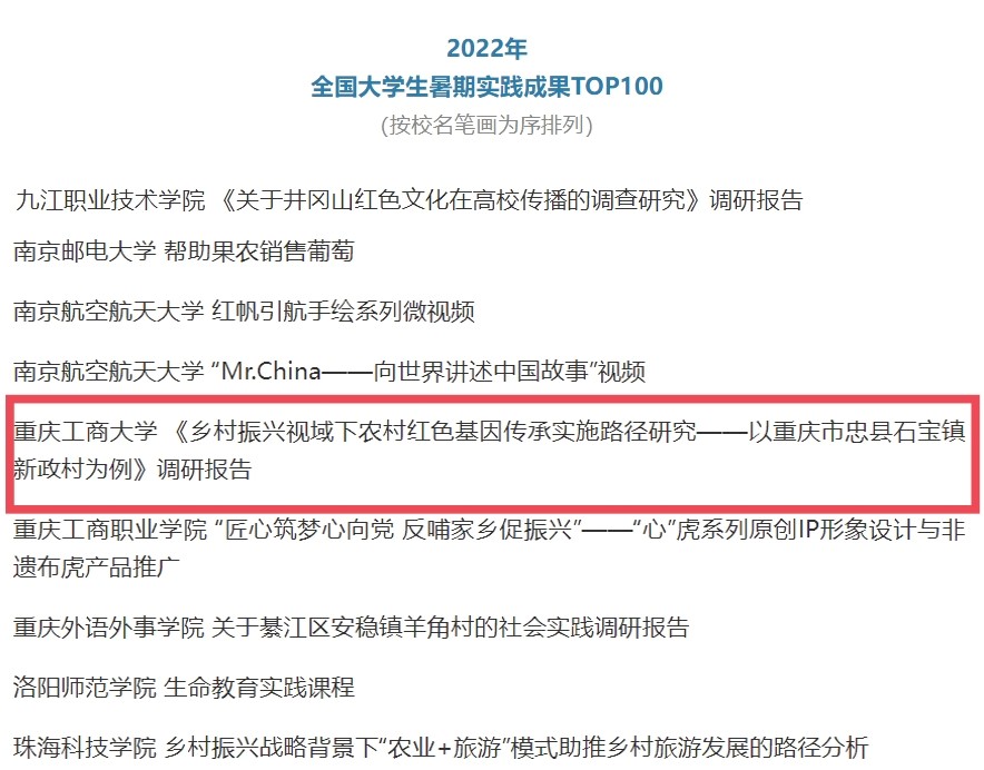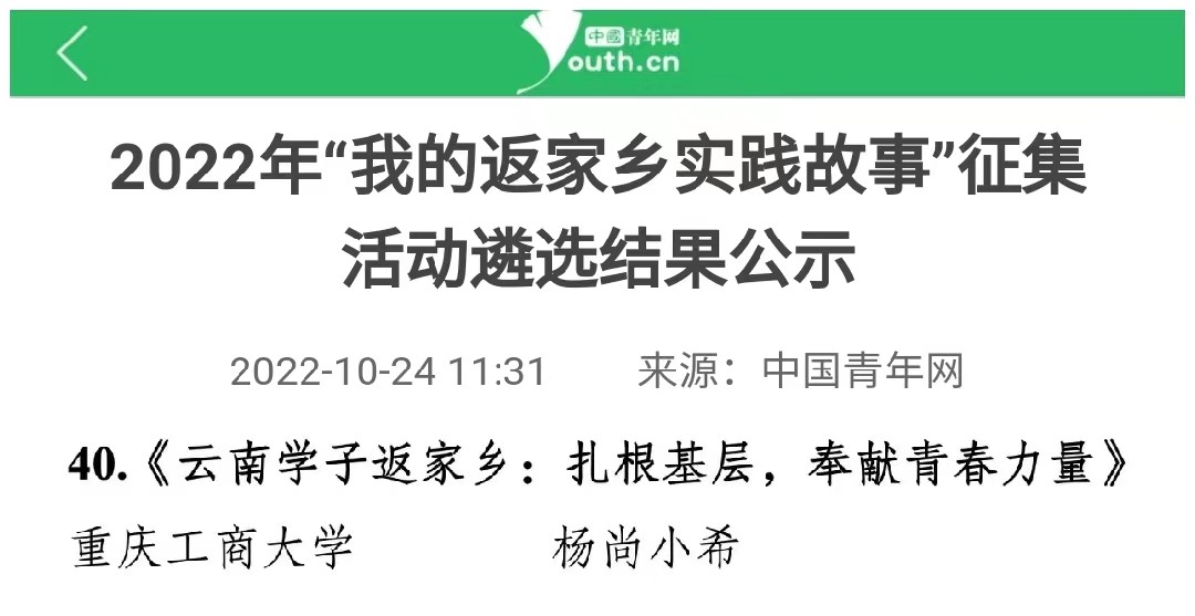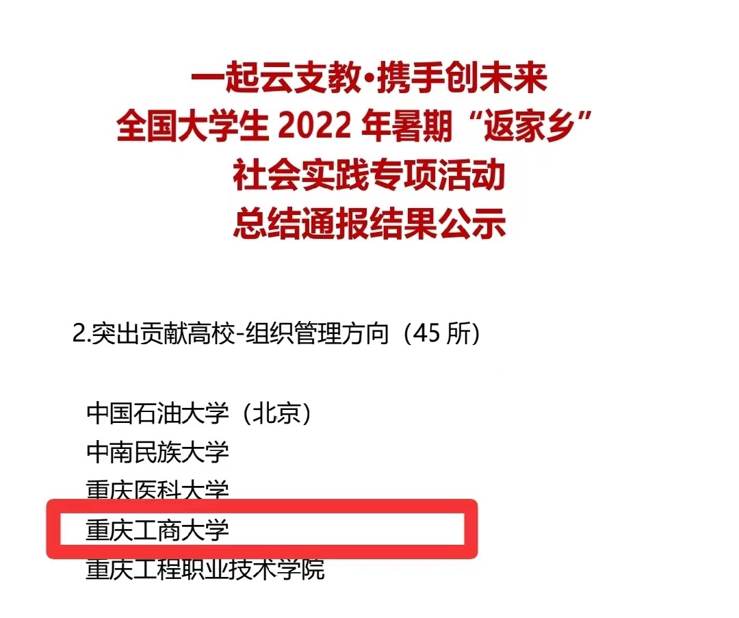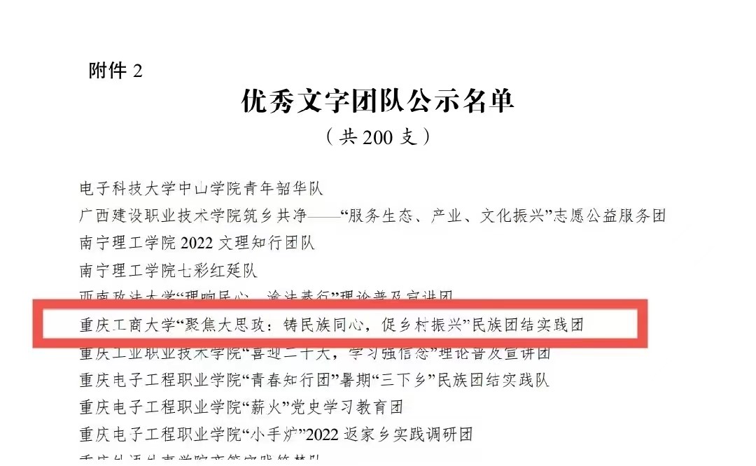 在中央宣传部、中央文明办、教育部、共青团中央、全国学联共同举办的2022年全国大中专学生志愿者暑期文化科技卫生“三下乡”社会实践活动评选中,pp电子金融学院“金裕民乡,融惠万家”发展成就观察团荣获2022年“三下乡”社会实践活动全国优秀团队。在共青团中央青年发展部、中国青年报、中国青年网共同举办的2022年“镜头中的三下乡”征集活动中,校团委荣获“全国优秀组织单位”奖项,金融学院“金裕民乡,融惠万家”发展成就观察团、国际商学院暑期“三下乡”赴新疆民族团结实践团荣获“全国优秀视频团队”奖项,法学与社会学学院青年普法志愿者服务队荣获“全国优秀图片团队”奖项,通识学院“聚焦大思政:铸民族同心,促乡村振兴”民族团结实践团荣获“全国优秀文字团队”奖项。在共青团中央青年发展部、中国青年报、中国青年网共同举办的2022年“我的返家乡实践故事”征集活动中,法学与社会学学院学子杨尚小希作品《云南学子返家乡:扎根基层,奉献青春力量》荣获全国优秀作品。在中国青年报社主办的2022年第八届全国大学生暑期实践展示活动中,通识学院聚焦“‘大思政’:铸民族同心,促乡村振兴”民族团结实践团完成的《乡村振兴视域下农村红色基因传承实施路径研究——以重庆市忠县石宝镇新政村为例》调研报告入选2022年全国大学生暑期实践成果百强榜单。在共青团中央青年发展部主办的“一起云支教·携手创未来”全国大学生2022年暑期“返家乡”社会实践专项活动中,pp电子荣获“突出贡献高校”奖。