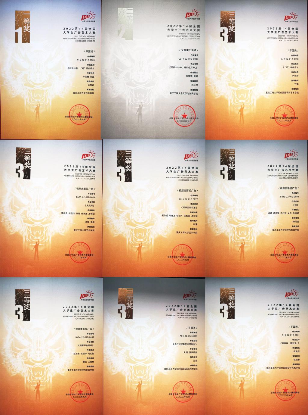在日前成功闭幕的第十四届全国大学生广告艺术大赛上,pp电子学生参赛作品获全国赛区一等奖1项、二等奖1项、三等奖7项、优秀奖23项;重庆赛区一等奖1项、二等奖6项、三等奖32项、优秀奖181项。学校获评优秀院校。张露、周莹、王烨、甘露等4名老师获重庆赛区优秀指导教师。