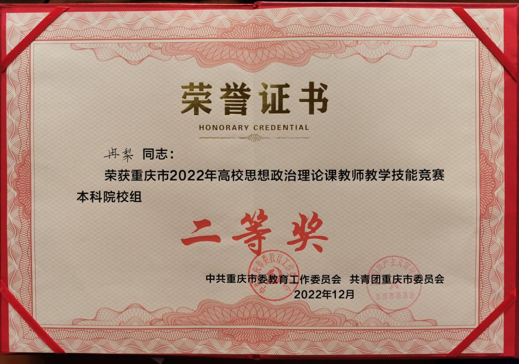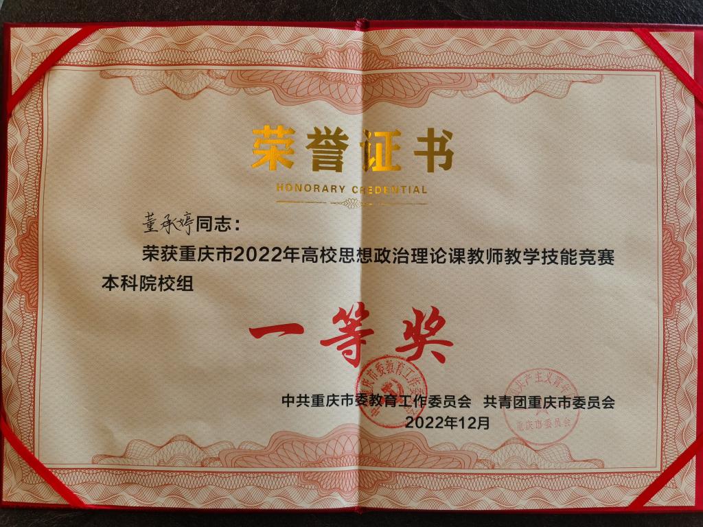 12月20日,2022年重庆市高校思想政治理论课教师教学技能大赛决赛在江津举行,经过激烈比拼,pp电子选派的思想政治理论课教师董承婷获得一等奖、冉梨老师获得二等奖。