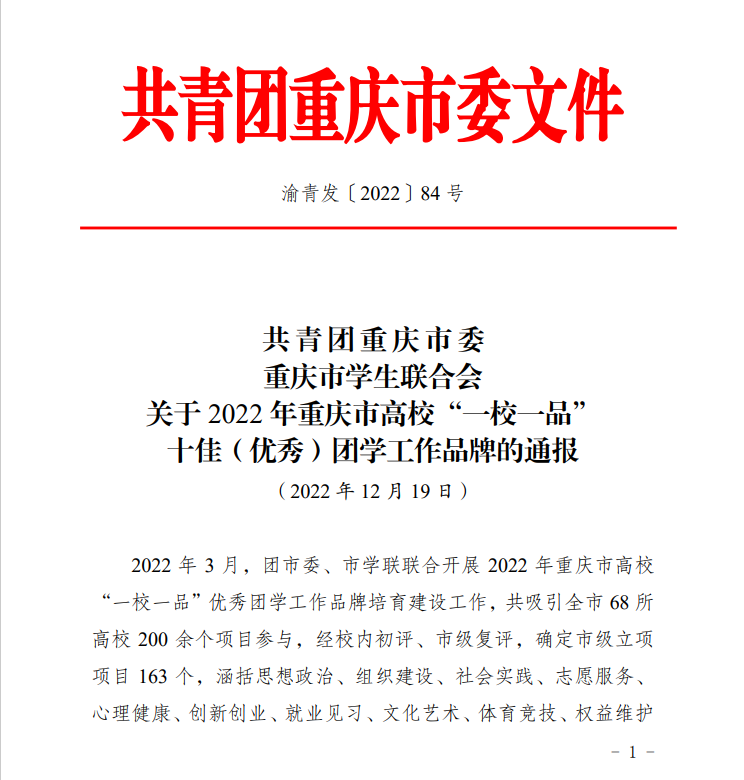 2022年重庆市高校“一校一品”优秀团学工作品牌培育建设工作由团市委、市学联联合开展,自今年3月份开始,共吸引全市68所高校200余个项目参与,经校内初评、市级复评,确定市级立项项目163个,涵括思想政治、组织建设、社会实践、志愿服务、心理健康、创新创业、就业见习、文化艺术、体育竞技、权益维护等10个类别。通过评估工作组开展线上交叉评估,择优遴选127个项目进入交流展示环节。12月11日,按照《重庆市高校“一校一品”优秀团学工作品牌培育建设管理办法(修订)》的相关规定,由机关、企事业单位、研究机构等领域专家组成的评审组对127个入围项目进行了答辩终审,最终评选出了10个“十佳团学工作品牌”项目、40个“优秀团学工作品牌”项目和10个“成长潜力团学工作品牌”项目。