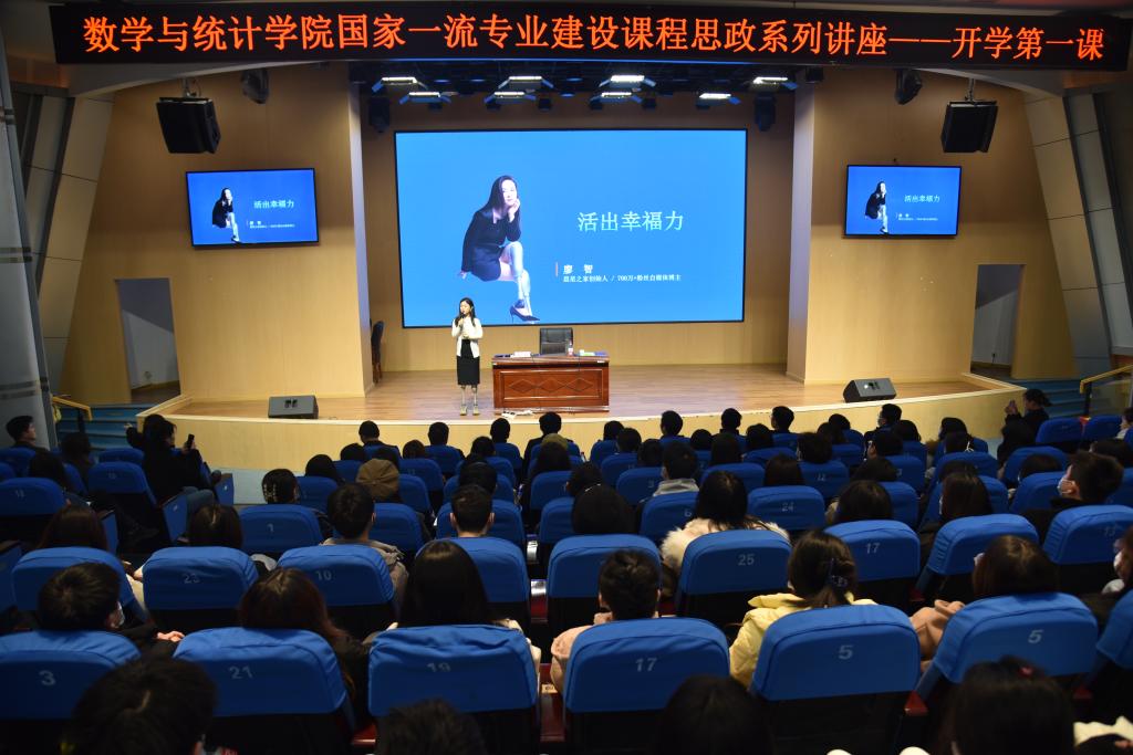 为了落实立德树人根本任务,做好国家一流专业建设课程思政工作,帮助同学们开好头、起好步,以饱满的精神面貌开启新学期、奋进新征程,在学校党委宣传部、党委学工部、教务处和校团委的指导下,在研究生院的支持下,数学与统计学院于3月3日下午,在明智楼110100报告厅举办了国家一流专业建设课程思政系列讲座——开学第一课。特别邀请到了央视《开学第一课》《开讲啦》等节目演讲嘉宾廖智女士为师生做专题报告。党委学工部副部长张朝毅、数学与统计学院党政领导和师生代表400余人聆听了这堂课,讲座由数学与统计学院副院长龙宪军主持。