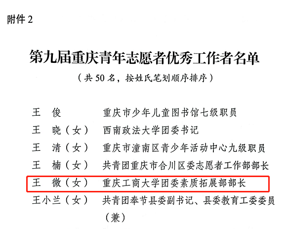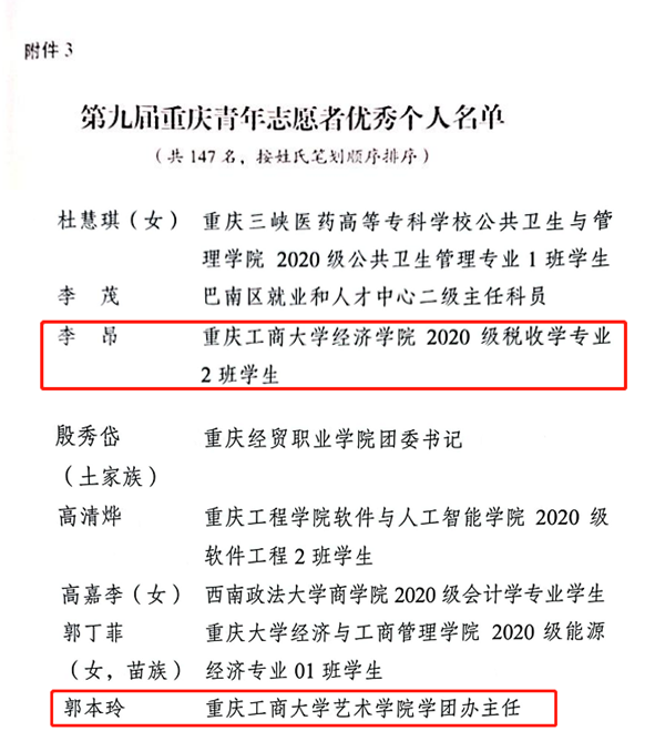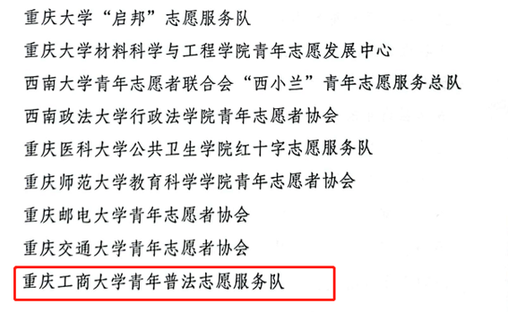 pp电子法学与社会学学院青年普法志愿服务队获评第九届重庆青年志愿者优秀集体,校团委王微老师获评优秀工作者,艺术学院郭本玲老师、经济学院2020级税收学专业2班学生李昂获评优秀个人。