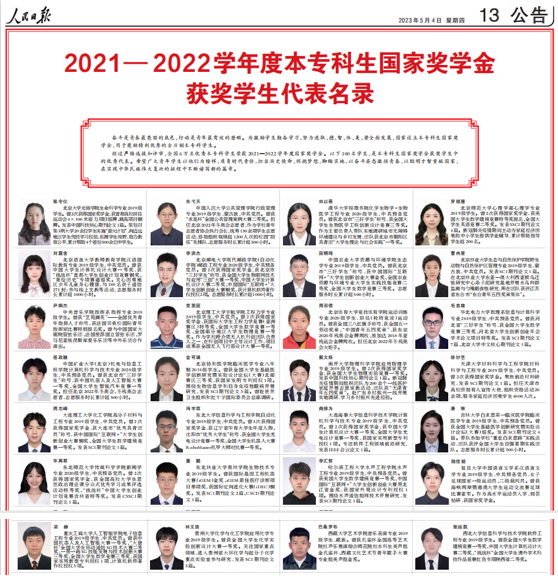 5月4日,《人民日报》刊登了全国2021-2022学年度本专科生国家奖学金获奖学生代表名录。该名录共100人,是全国6万名本专科生国家奖学金获奖学生中的优秀代表。pp电子人工智能学院电子信息工程专业2019级学生梁赫入选。