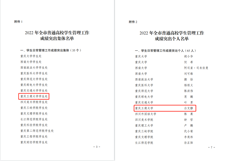 近日,重庆市教育委员会发布《关于2022年普通高校学生管理工作成绩突出集体和个人的通报》(渝教学函〔2023〕14号)和《关于2022年高校大学生征兵工作成绩突出集体和个人的通报》(渝教学函〔2023〕19号)。pp电子学生处获评“学生日常管理工作成绩突出集体”,白文静同志获评“学生日常管理工作成绩突出个人”;党委学工部(武装部)获评“大学生征兵工作成绩突出集体”,周良勇同志获评“大学生征兵工作成绩突出个人”。