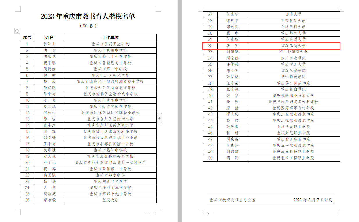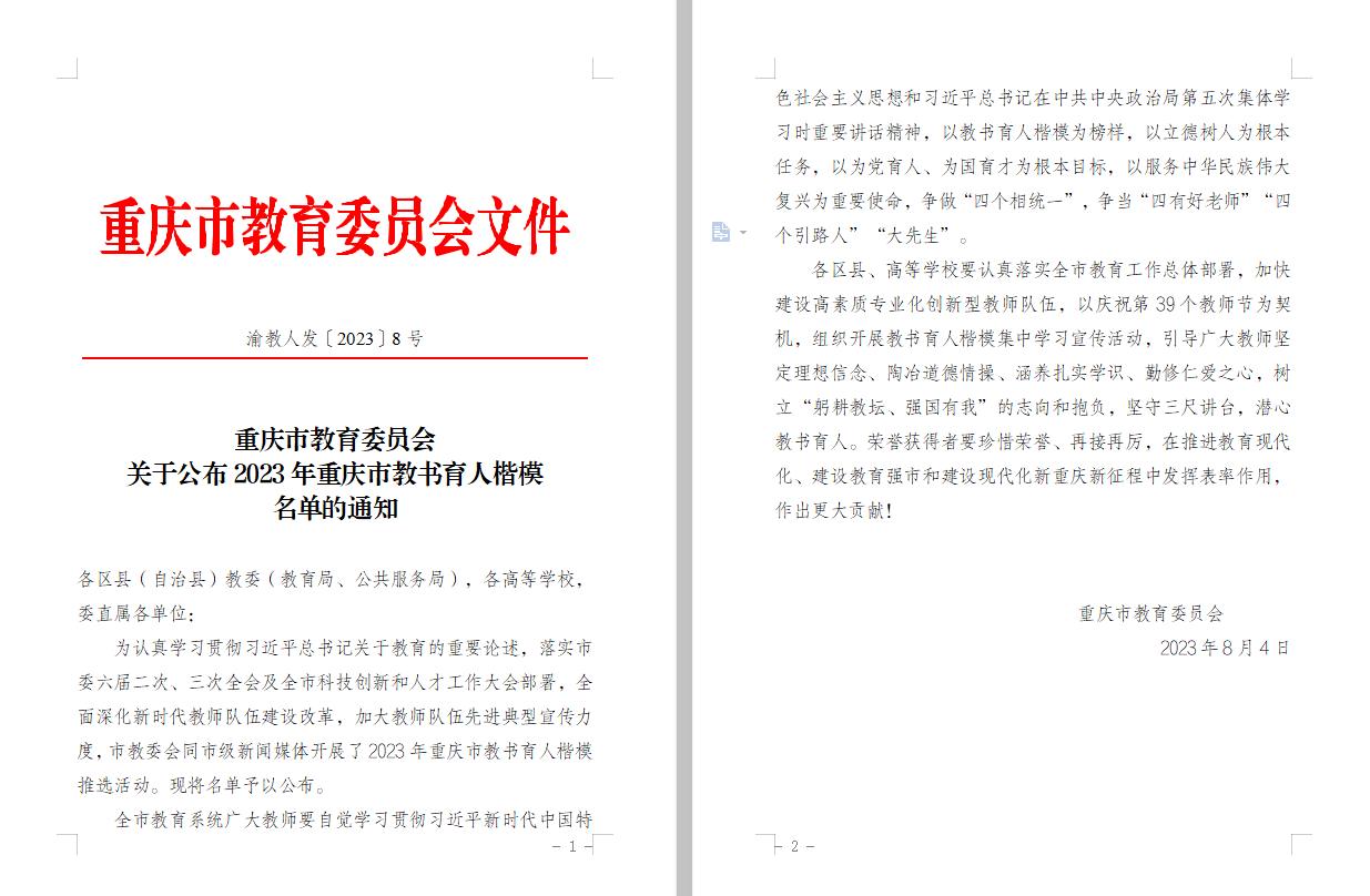 为认真学习贯彻习近平总书记关于教育的重要论述,落实市委六届二次、三次全会及全市科技创新和人才工作大会部署,全面深化新时代教师队伍建设改革,加大教师队伍先进典型宣传力度,市教委会同市级新闻媒体于2023年5月至8月开展了教书育人楷模推选活动,经各区县、各高校推荐、专家综合评审、活动组委会审定等环节,共选树出50名重庆市教书育人楷模(其中高校教师25名)。pp电子管理科学与工程学院教师龚英获评“2023年重庆市教书育人楷模”。