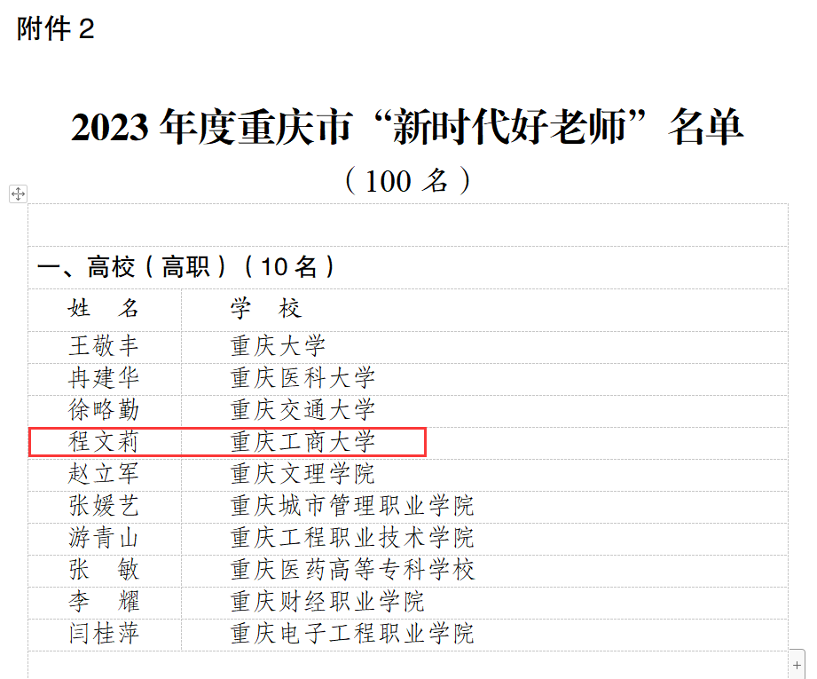 为深入贯彻落实党的二十大精神,贯彻落实习近平总书记关于青少年成长成才、加强家风家教和师德师风建设等方面的重要讲话精神,贯彻落实市委六届二次全会精神,2023年3月至6月,市委宣传部、市文明办、市教委、团市委、市妇联、市关工委联合开展了重庆市 2023 年度“新时代好少年、好老师、好家长”学习宣传活动。经区县(各高校)推荐、专家综合评审、活动组委会审定等环节,选树出“新时代好老师”100名(其中高校教师10名),pp电子会计学院教师程文莉获评“新时代好老师”。