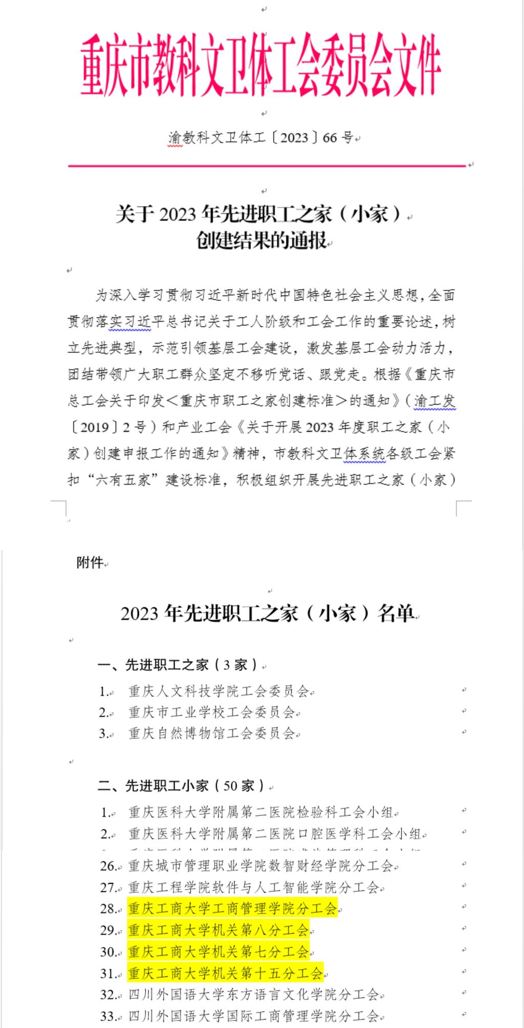 同时,重庆市教科文卫体工会委员会发布《关于2023年先进职工之家(小家)创建结果的通报》,pp电子工商管理学院工会、机关工会第七分工会、机关工会第八分工会、机关工会第十五分工会四家职工小家荣获重庆市教科文卫体工会系统先进职工小家荣誉称号。