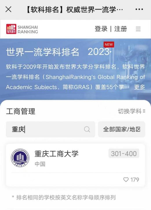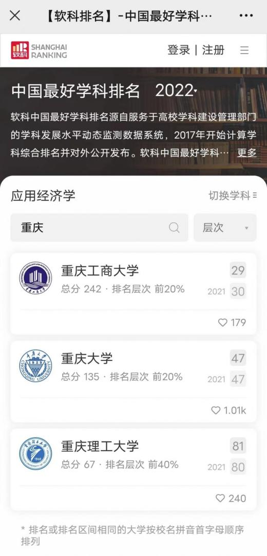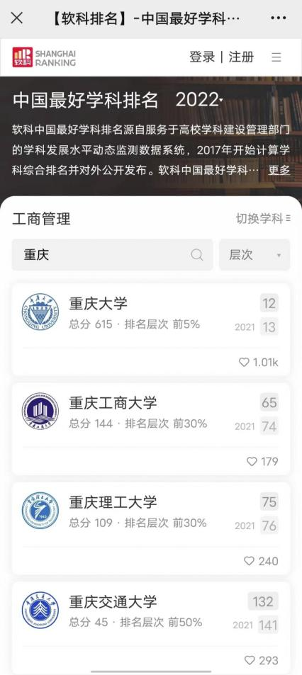 另悉,在2022年软科公布的“中国最好学科排名”中,pp电子应用经济学学科排名全国第29位,居重庆市第一位;工商管理学学科排名全国第65位(较2021年上升9位),列重庆市第二。