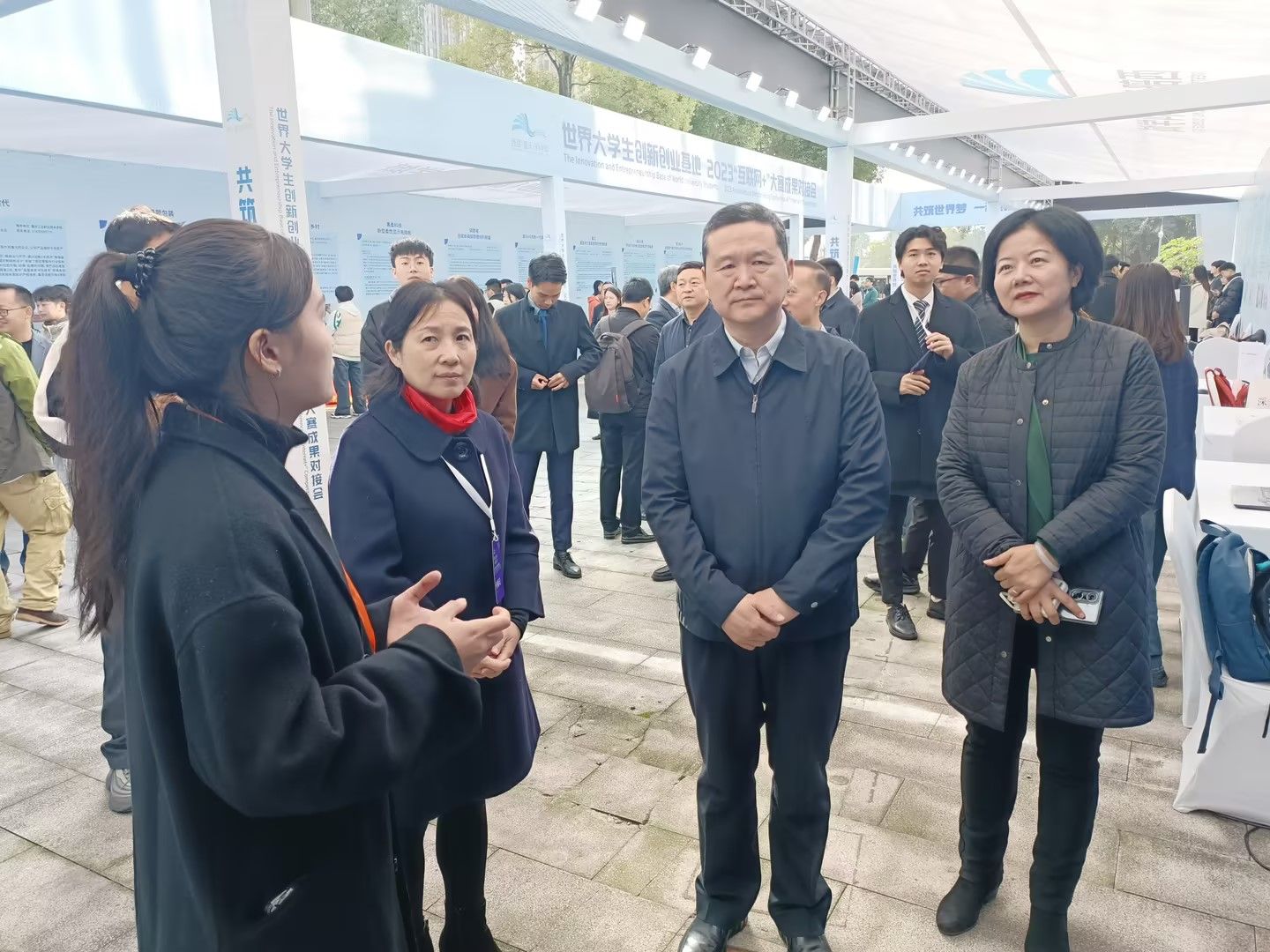 在pp电子“互联网+”大赛项目展示区前,教育部高等教育司武世兴副司长和市教委副主任蒋云芳听取了项目组的汇报,对项目给予高度评价,认为其创新思维打破了技术壁垒,项目成果对全国松材线虫病枯死树普查及监测具有重大的示范意义和创新开拓性。