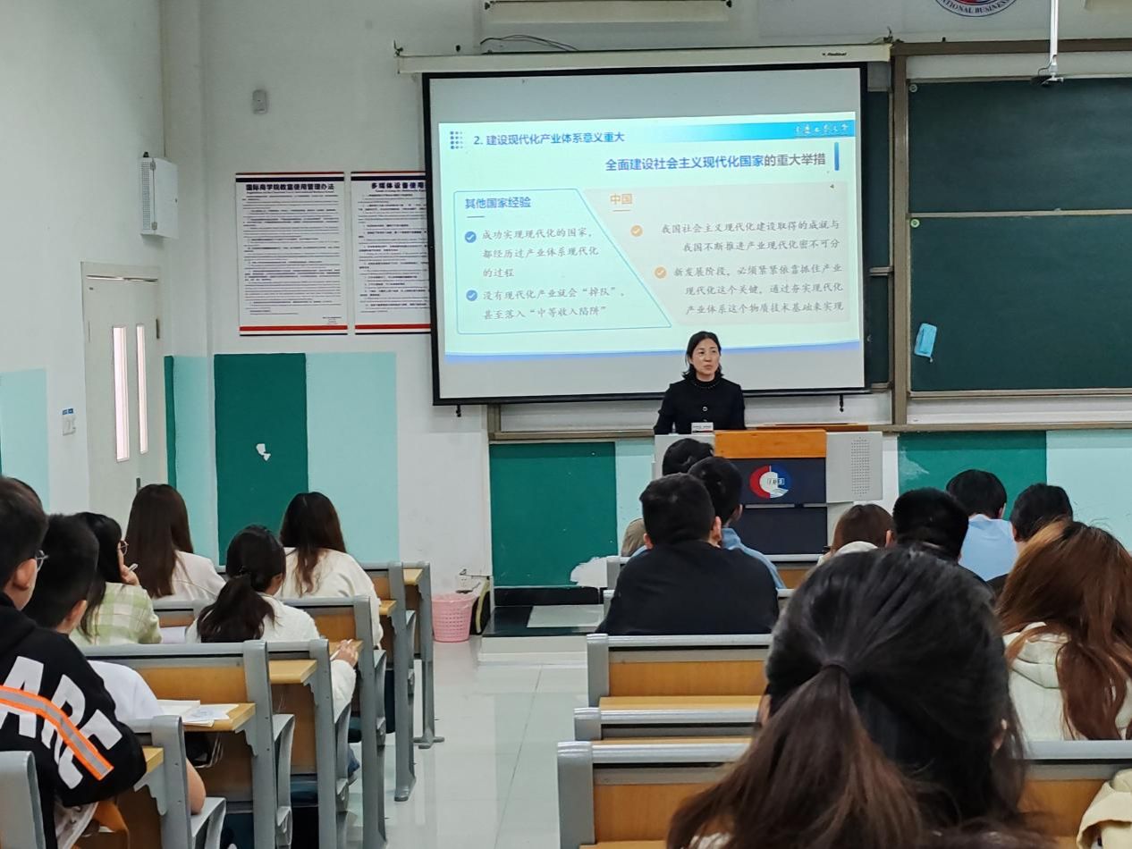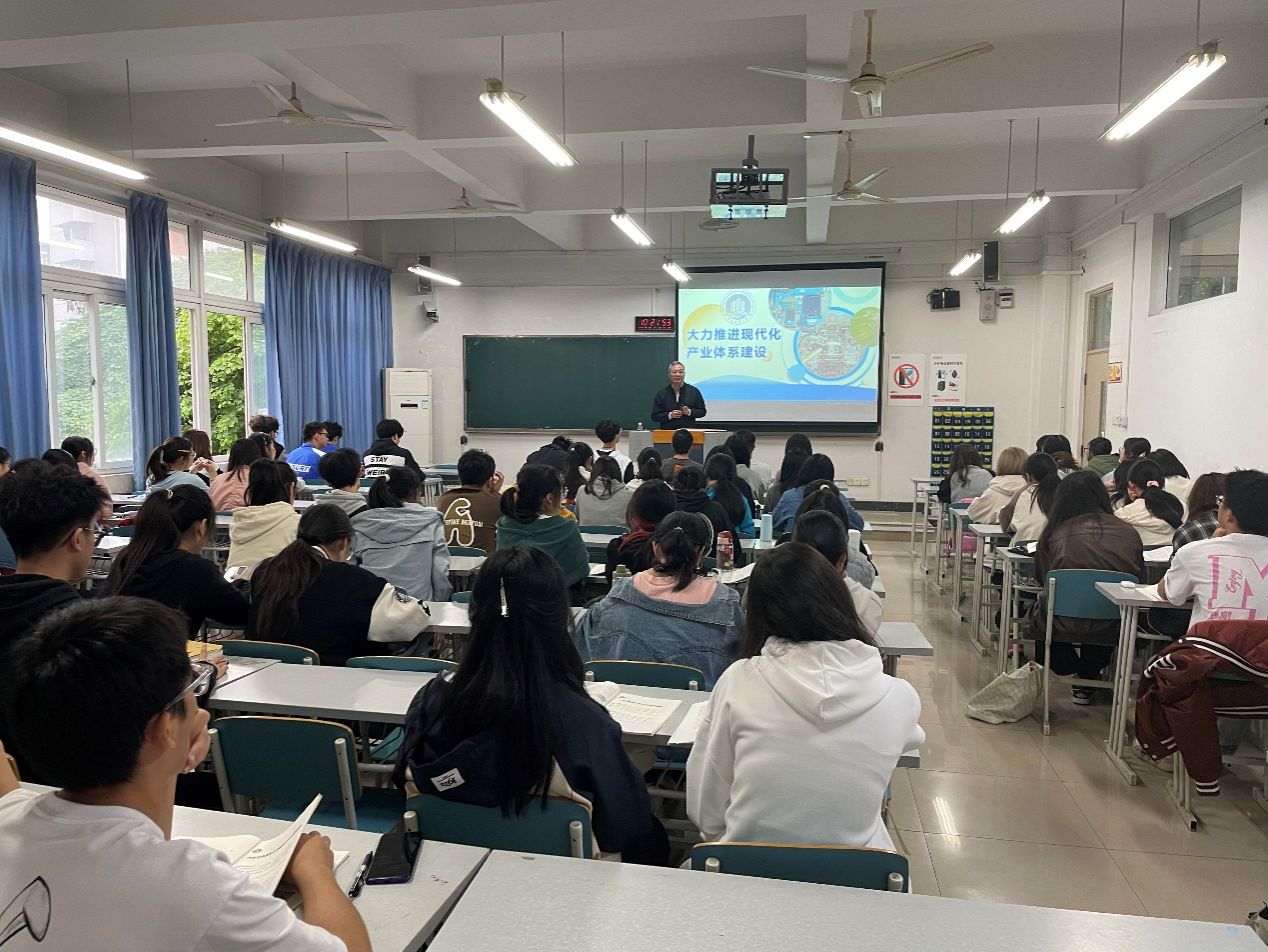 10月19日上午,学校党委常委、副校长李国军在江北校区宏智楼305教室,以“大力推进现代化产业体系建设”为主题,为2023级工商管理类(财会)十一班、统计班学生讲授了一堂生动的形势与政策课。李国军以“介绍自己的家乡”为切入点,从“现代化产业体系的深刻意蕴”“现代化产业体系建设的现状与挑战”“推进现代化产业体系建设着力点”三个方面为同学们深入全面地讲解了建设现代化产业体系的整体布局和深刻内涵。李国军鼓励同学们要志存高远、学好专业知识,不断提升自己,为我国现代化产业体系建设和国家发展贡献自己的力量。