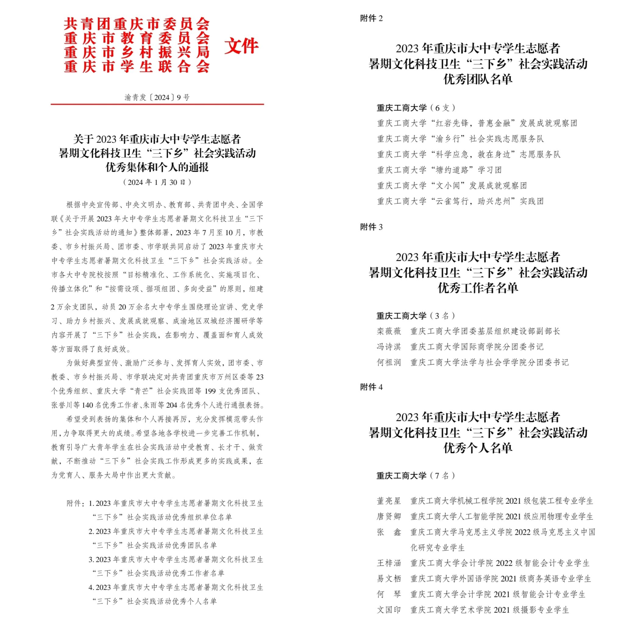 在重庆市“三下乡”社会实践活动总结评选中,金融学院“红岩先锋,普惠金融”发展成就观察团等6支团队获市级优秀团队、校团委栾薇薇老师等3位教师获市级优秀工作者、机械工程学院董亮星等7位同学获市级优秀个人;在“金色之秋”重庆市“三下乡”社会实践成果遴选活动中,法学与社会学学院《重庆市合川区涞滩镇二佛村文化振兴》调研报告等5项调研报告获市级优秀、通识学院“助力成渝双城经济圈建设,以主题教育思维构建社会实践新格局赋能乡村振兴实践探索”实践项目等3个实践项目获市级奖项。