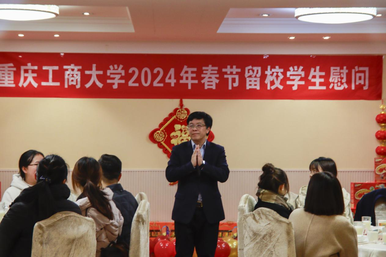 曾维伦代表学校向师生们致以新春问候。他谈到,今天是个好日子,大家欢聚在美丽的校园,共迎甲辰龙年,共叙师生情谊。感谢大家一年来为学校发展作出的贡献,重工商大永远是大家共同的家园。他表示,因实习实践、学习科研等各种原因,留校同学们不能回家与家人团聚过年,学校将会在学习生活等各方面全力提供后勤保障,让大家在学校过一个欢乐祥和的春节。同时,他叮嘱同学们多与家人联系,打个电话报平安,发条微信送祝福,让家人放心、安心。最后,他预祝老师和同学们在新一年里取得更大进步。