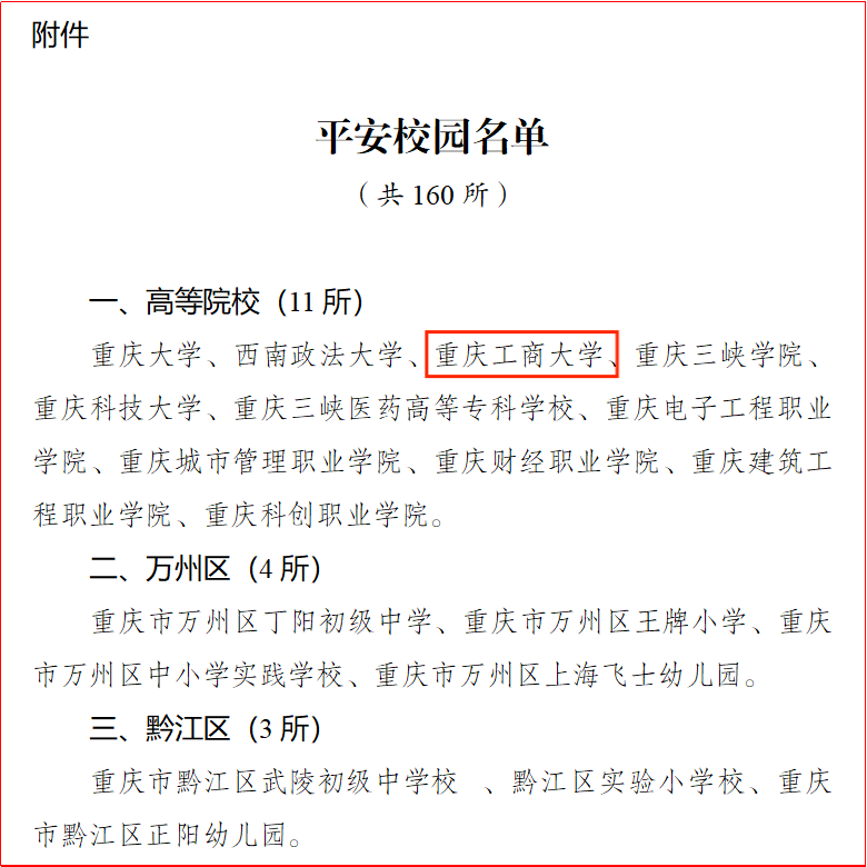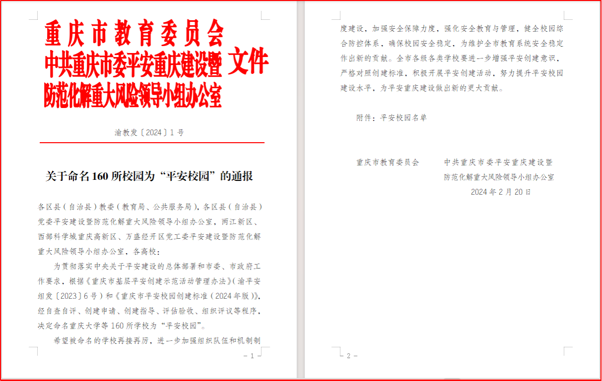 2月20日,重庆市教育委员会、中共重庆市委平安重庆建设暨防范化解重大风险领导小组办公室联合印发《关于命名160所校园为“平安校园”的通报》(渝教发〔2024〕1号),决定命名全市160所学校为“平安校园”,其中,高等院校11所(本科院校5所,高职专科6所),pp电子位列本科院校第3名。