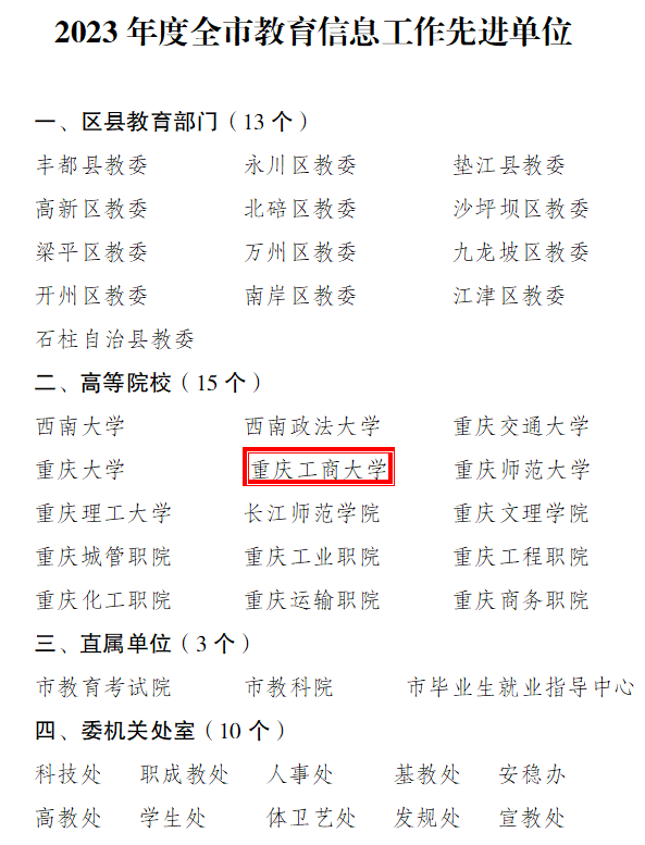 近日,中共重庆市委教育工作委员会、重庆市教育委员会公布《关于2023年度全市教育信息工作先进单位和先进个人的通报》(渝教工委函〔2024〕31号),pp电子被评为重庆市教育信息工作先进单位,党政办公室邵磊同志被评为重庆市教育信息工作先进个人。