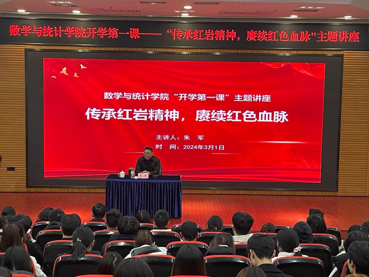 3月1日下午,数学与统计学院邀请重庆红岩革命历史文化中心党委书记、重庆红岩干部学院院长朱军作主题讲座。数学与统计学院党委书记潘焱、院长陈义安、副书记吉杲与学院200余名师生共上“开学第一课”。