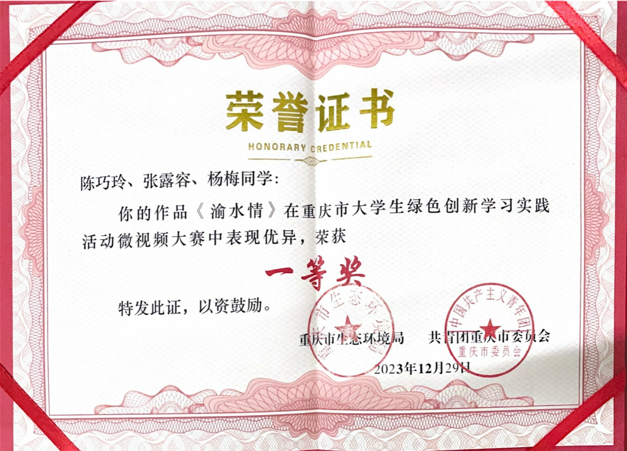 近日,重庆市大学生绿色创新学习实践活动微视频大赛传来喜讯,文学与新闻学院学生陈巧玲、杨梅、张露容在陈绍富老师指导下创作完成的短视频《渝水情》荣获大赛一等奖。