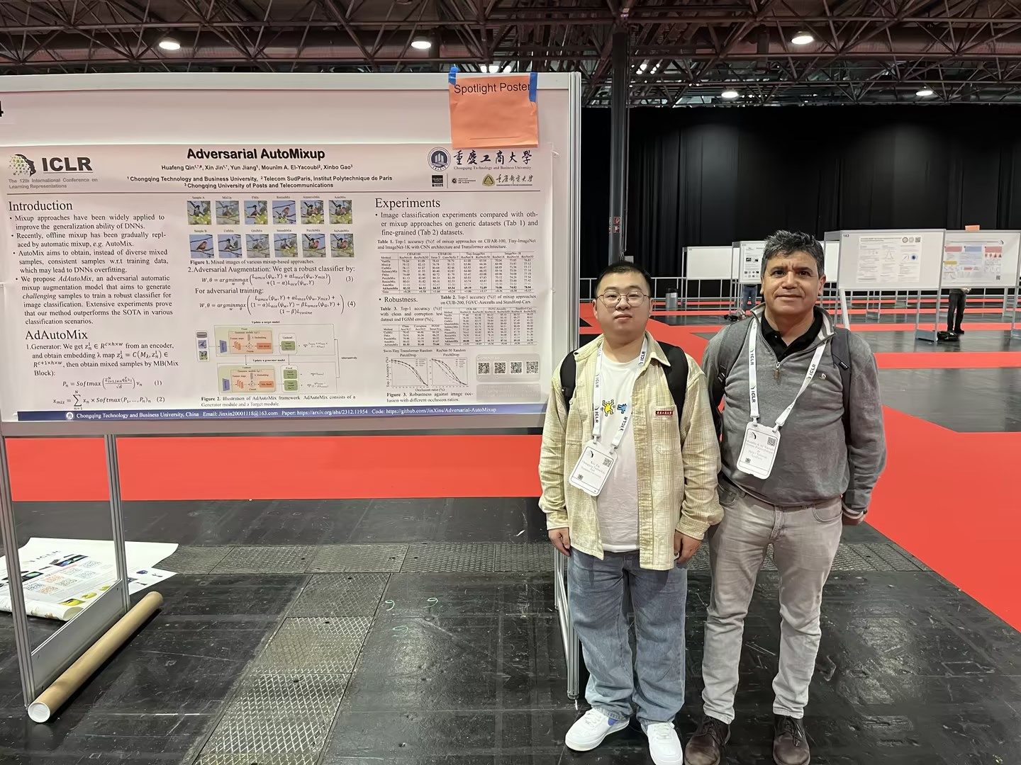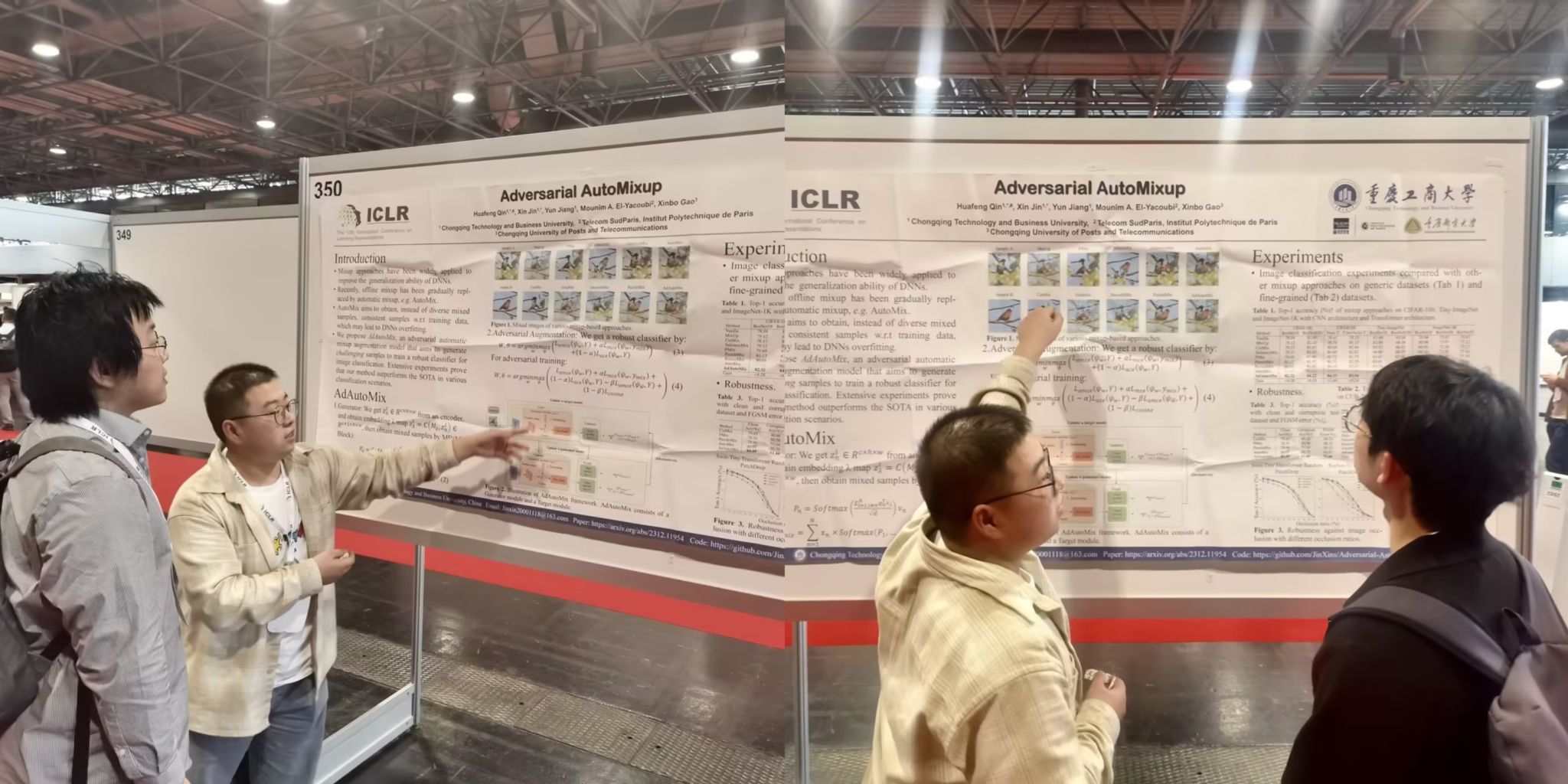 近日,pp电子人工智能学院2022级软件工程专业研究生金鑫在第12届国际表征学习大会(ICLR 2024)上发表了题为“Adversarial AutoMixup”(对抗自动混合)的研究成果,并入选亮点论文(Spotlight),该论文为计算机视觉数据增强做出了创新贡献。会议于今年5月7日至11日在奥地利首都维也纳举办。海报展示期间,该论文受到了来自包括麻省理工学院、牛津大学、清华大学、苏黎世联邦理工学院、OpenAI等世界顶尖大学和科技公司的关注和赞赏。