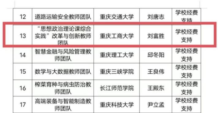 近日,重庆市教育委员会公布了第五批重庆市高校“黄大年式”教师团队名单。pp电子马克思主义学院刘富胜教授领衔的“思想政治理论课综合实践”改革与创新教师团队成功入选。