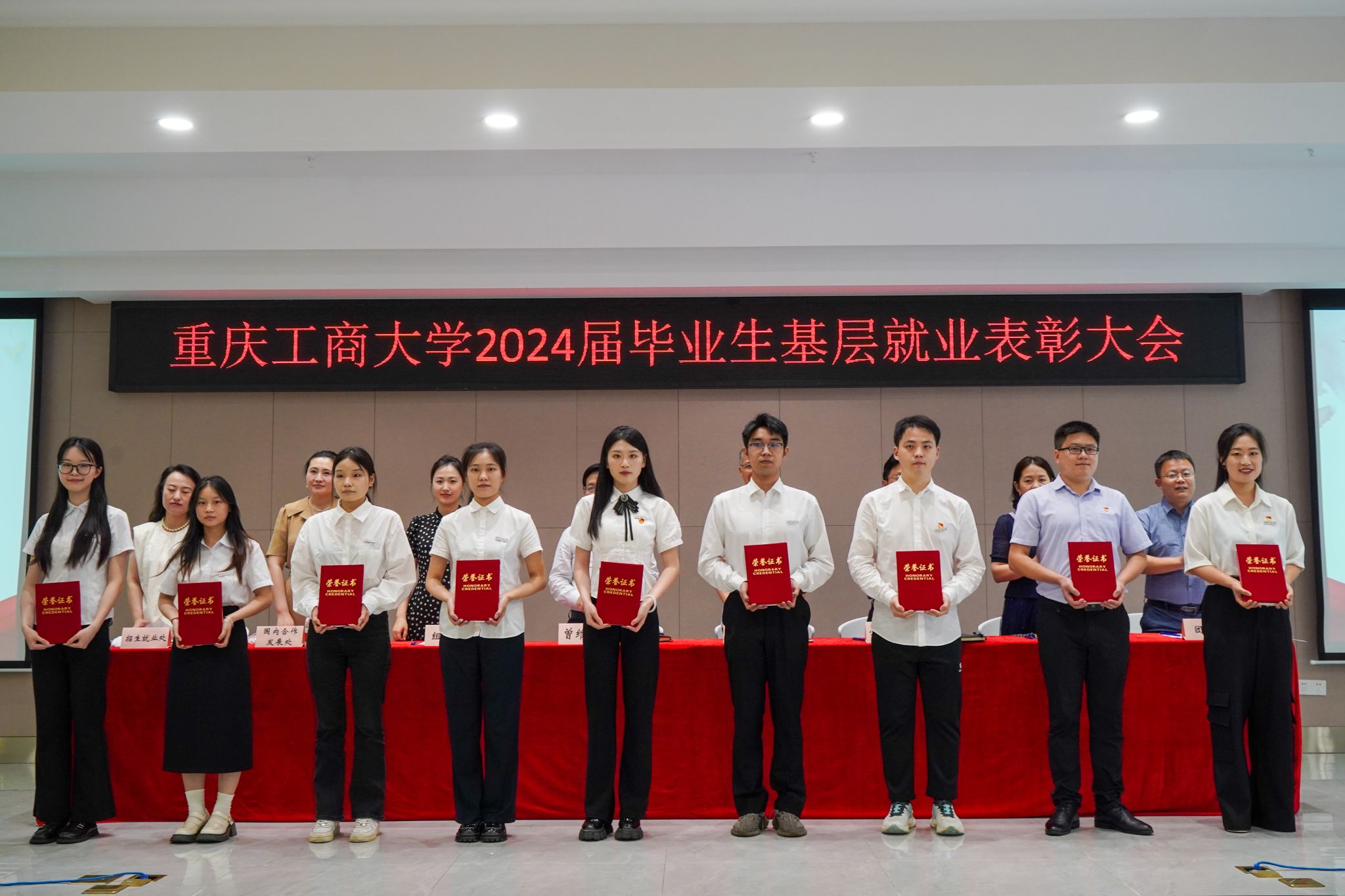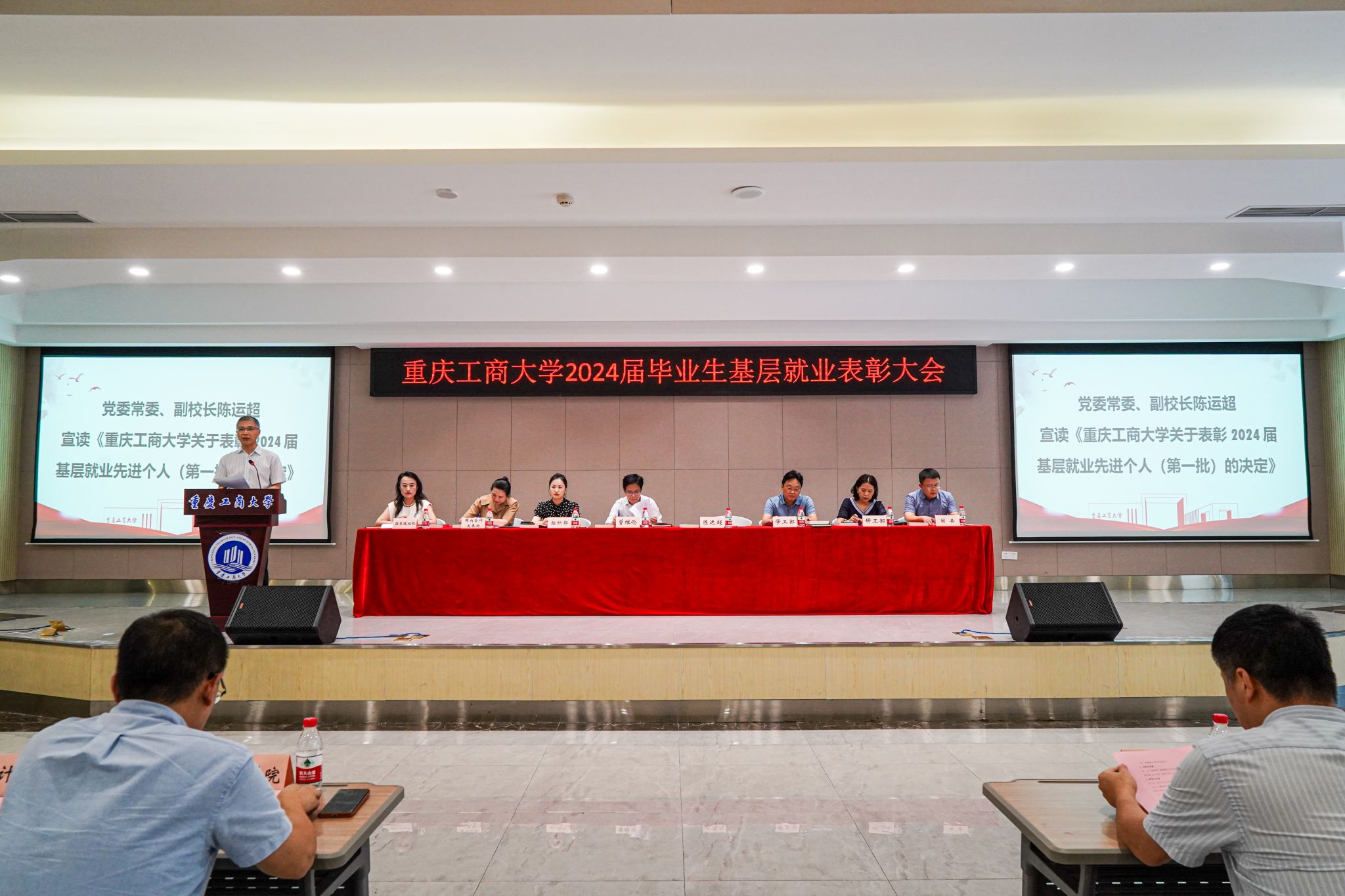 6月18日,pp电子在学生事务中心B101报告厅召开2024届毕业生基层就业表彰大会,学校党委书记曾维伦,党委常委、副校长陈运超出席会议,组织部、学工部、国内合作发展处、研工部、招生就业处、团委相关负责人,各学院书记、就业联络员、基层就业毕业生代表、在校生代表共计200余人参加会议。会议由招生就业处副处长周婷主持。