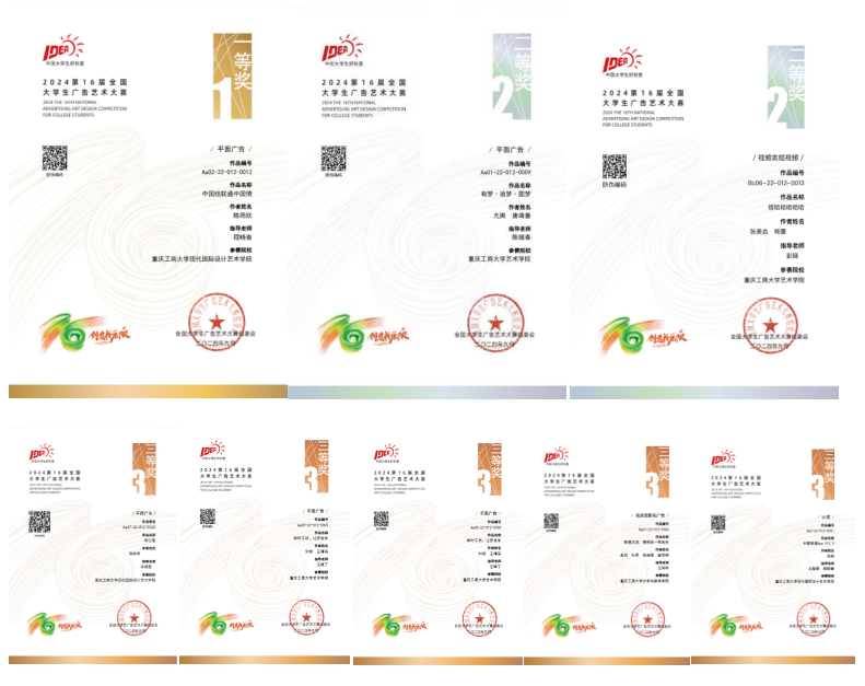 第十六届全国大学生广告艺术大赛(重庆赛区)省级等级奖53项,其中一等奖8项、二等奖21项、三等奖24项、优秀奖292项,累计347项。