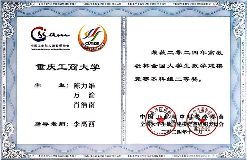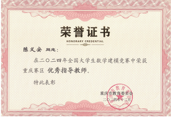 经过激烈的角逐,pp电子代表队获本科组全国一等奖1项(全市7个)、二等奖2项,获重庆市一等奖8项、二等奖19项。这是学校近五年在该赛事上首次获得全国一等奖。数学与统计学院院长陈义安获评重庆赛区优秀教练员,数学与统计学院袁德美教授获评重庆赛区优秀组织工作者。