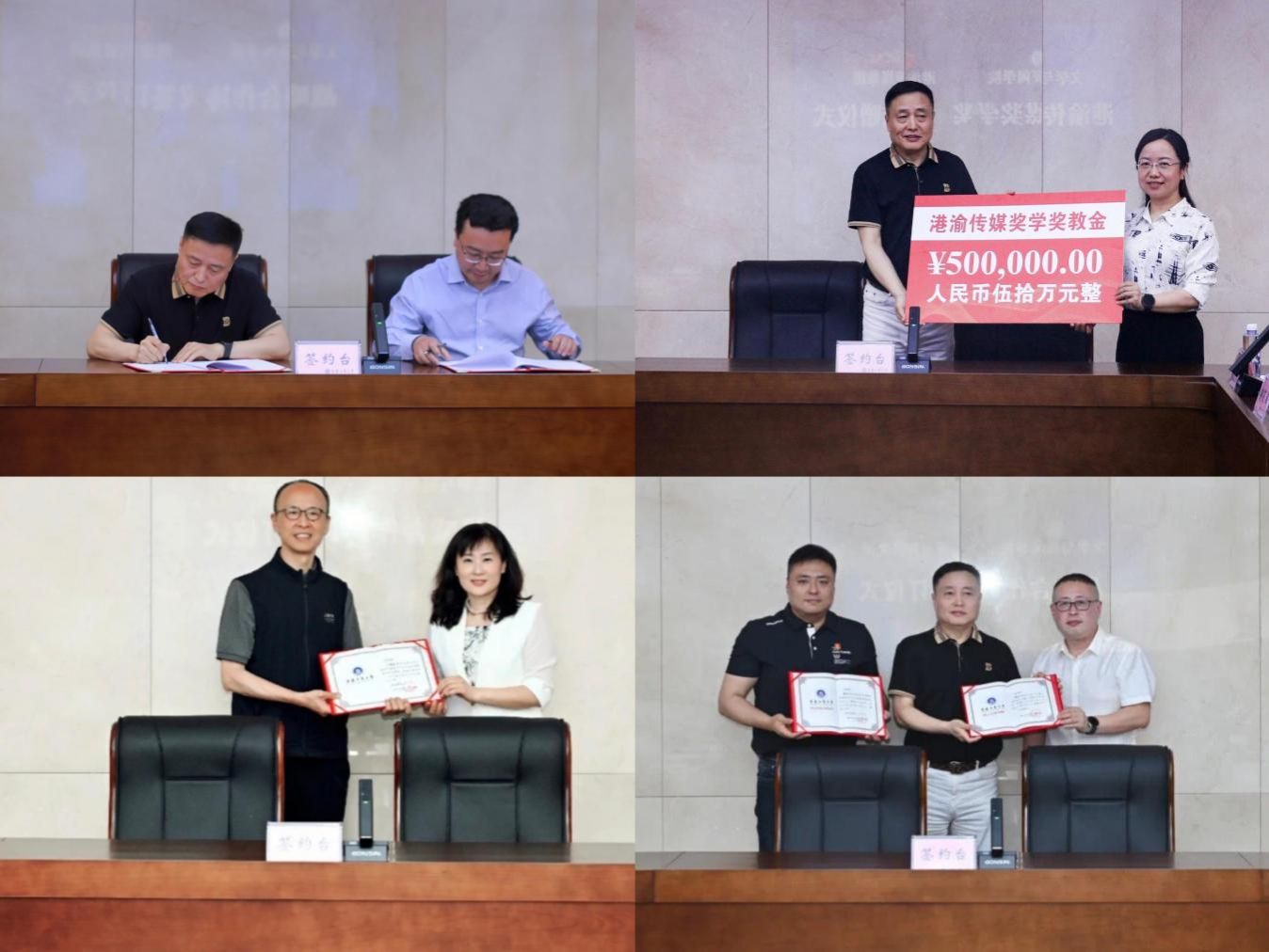 柏平与文学与新闻学院院长殷俊代表双方签署战略合作协议,学院党委书记潘焱作为代表接受奖学奖教金捐赠。根据合作协议,港渝集团将在文学与新闻学院设立专项基金,用于奖励学院优秀师生。同时,张海燕向柏平授“重庆市全媒体传播现代产业学院港渝集团分院”标识牌。学院党委副书记程元元向柏平、阿地力颁发行业导师聘书,张海燕向丁道谊颁发分院总顾问聘书。