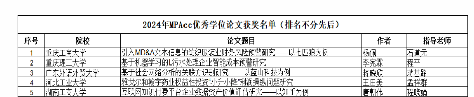 5月7日,全国会计专业学位研究生教育指导委员会公布了2024年MPAcc优秀学位论文奖名单,一共28篇学位论文获奖。pp电子会计学院杨佩同学撰写(指导教师:石道元教授)的论文《引入MD&A文本信息的纺织服装业财务风险预警研究——以七匹狼为例》获奖。