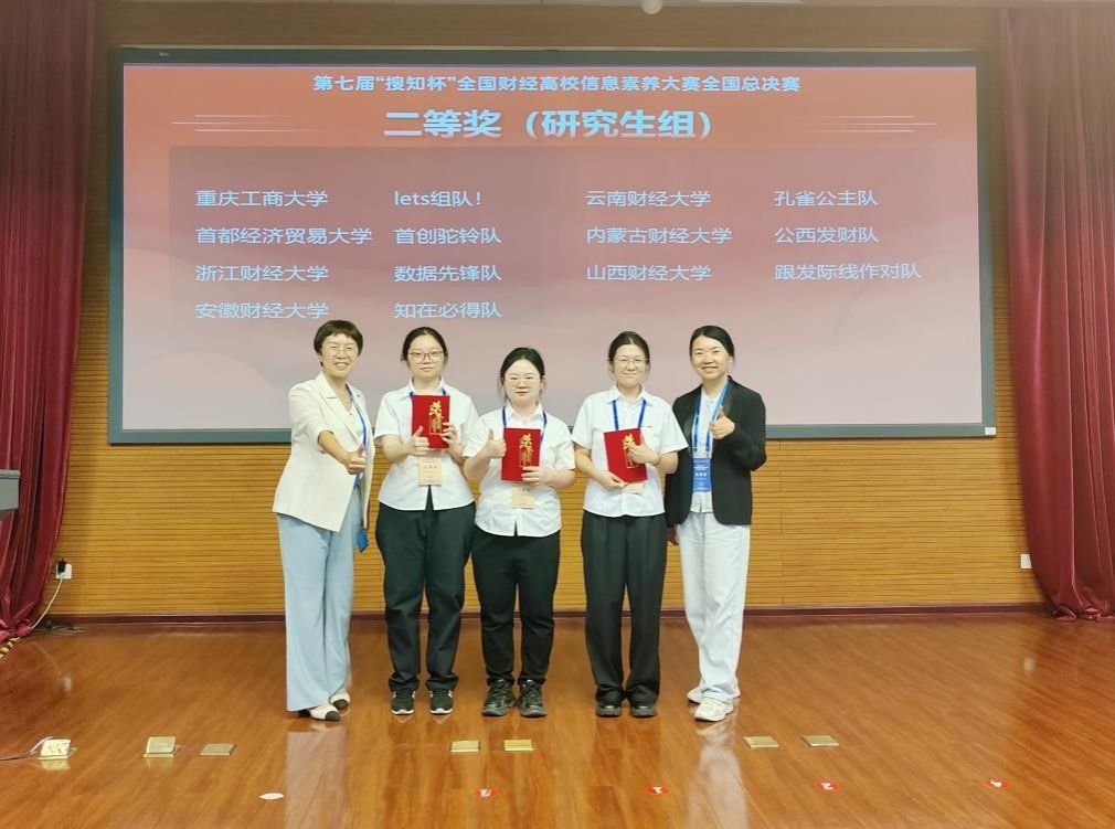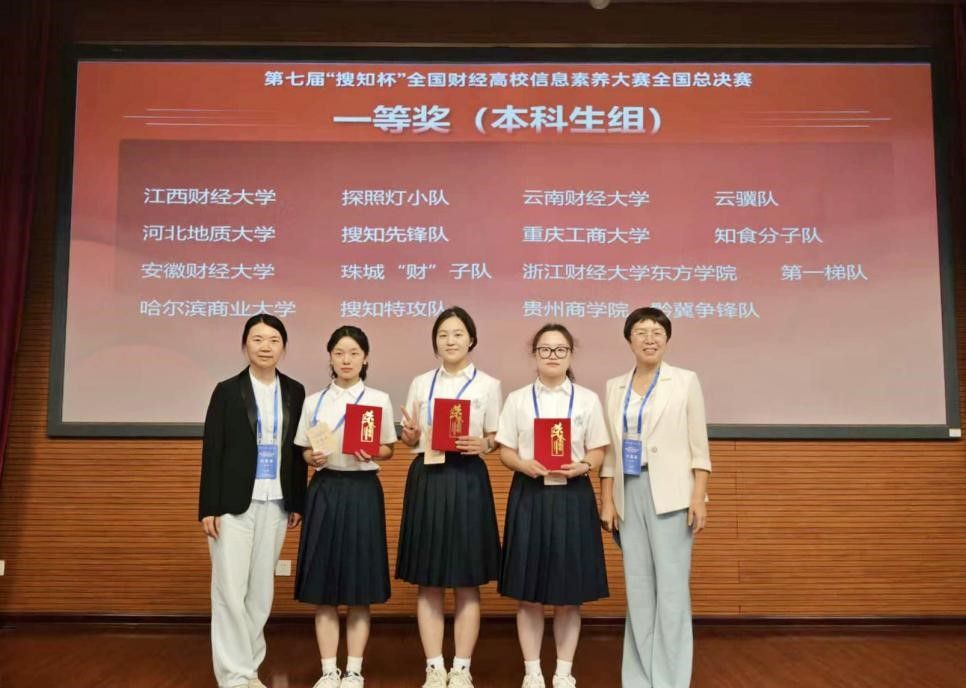 5月18日,第七届“搜知杯”全国财经高校信息素养大赛全国总决赛圆满闭幕,pp电子学生代表队取得历届参赛以来的最好成绩。今年共有39支本科生队伍、22支研究生队伍参加总决赛,经专家委员会评审,pp电子本科生代表队(工商管理学院 李卓优、周欢,食品科学与工程学院 况璎容)获总决赛一等奖、研究生代表队(法学与社会学院 黄倩、孙志扬,会计学院 闫年)获得总决赛二等奖。指导教师陈翠岚、刘非获得最佳指导教师奖,学校获得组织奖。
