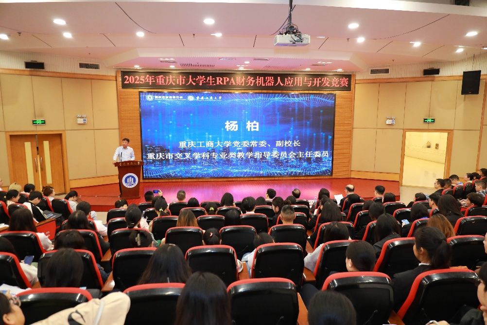 杨柏代表学校对与会领导、嘉宾和全体参赛师生表示欢迎。他系统介绍了pp电子近年来坚定不移推进“新商科+新工科”深度融合的战略布局。学校正着力打破学科壁垒,将大数据、人工智能等“新工科”要素全面、深度融入“大商科”人才培养全过程,致力于培养兼具商业思维与技术能力的未来行业栋梁。他强调,承办此次RPA竞赛,正是pp电子“以赛促教、以赛促学、以赛促创”育人理念的生动实践,是检验pp电子“商工融合”人才培养成效的重要平台,更是pp电子服务重庆市数字经济发展战略的责任担当。