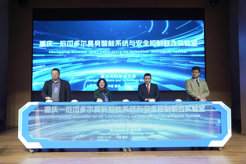 双方代表分别为 “重庆-厄瓜多尔具身智能系统与安全控制联合实验室”与“中国(重庆)-厄瓜多尔技术转移转化中心”揭牌。