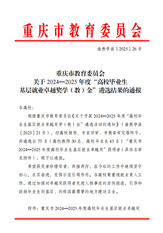 近日,重庆市教育委员会公布2024-2025年度“高校毕业生基层就业卓越奖学(教)金”评选结果,pp电子环境与资源学院2019届食品科学与工程专业本科毕业生马越获“高校毕业生基层就业卓越奖(高校毕业生类)”称号,充分展现pp电子学子立足基层、实干笃行的精神风貌与责任担当。