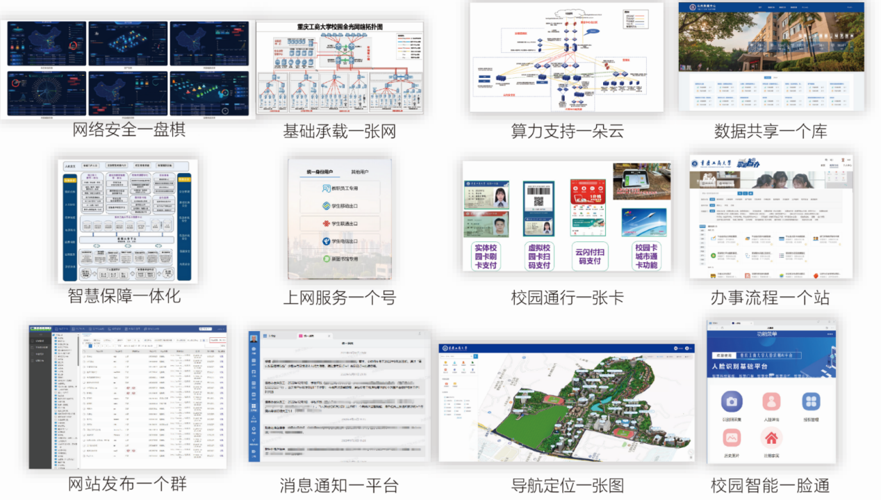 集成了“网络安全一盘棋、基础承载一张网、算力支持一朵云、数据共享一个库、教学保障一体化、上网服务一个号、校园通行一张卡、办事流程一个站、网站发布一个群、消息通知一平台、导航定位一张图、校园智能一脸通”等12大数字基础底座,为数字校园建设提供坚实的底座支撑。