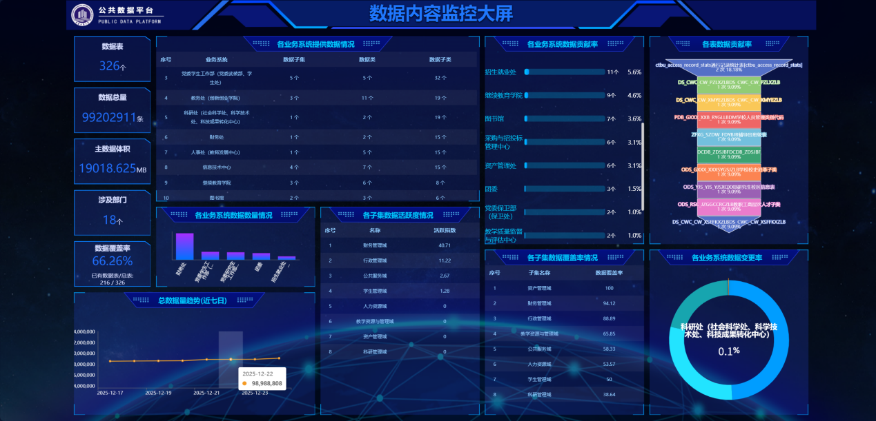 建成了包含数据治理平台和数据开放平台的“pp电子游戏平台网站公共数据中心”。完成了“财务管理、资产管理、行政管理、人力资源、教育资源、学生管理、科研管理、公共服务”等8大领域数据采集、数据治理和数据共享工作,有效促进了数据要素的流通共享与创新赋能。
