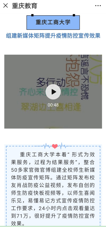 宣传部舆情组及时收集和梳理师生关于疫情防控的舆情,形成舆情专报2期;学校新媒体矩阵联盟先后转发《新型冠状病毒防护须知》以及《@全体重工商大人!面对新型病冠状病毒,我们应该这样做!》等稿件,发起《我是pp电子游戏平台网站青年,面对疫情,我承诺》活动,并通过矩阵发布校友肖战防疫公益视频和学校自创的5个版本的pp电子游戏平台网站师生防疫快板视频等,以师生喜闻乐见,易懂易记的方式宣传疫情防控工作要求,点击观看量近100万,提升了疫情防控知识普及和工作要求宣传效果,被教委防疫简报报道介绍。